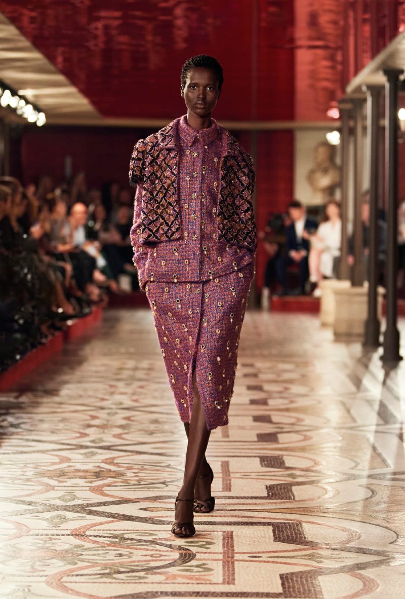 La colección de Chanel Alta Costura Otoño-Invierno 2024/25 abre con su repertorio de trajes de tweed. Ahora, el conjunto se reimagina con un toque nostálgico, un corte más cuadrado y boxy y con estilos referentes a la edad dorada de la ópera parisina. La silueta de hombros marcados y escotes cuadrados se traduce también a vestidos, capas de plumas y abrigos deconstruidos de grandes proporciones.