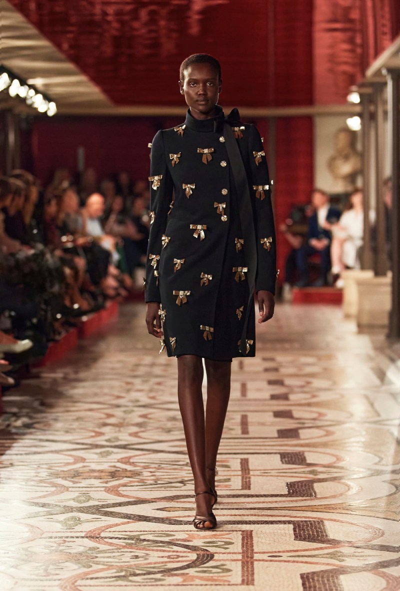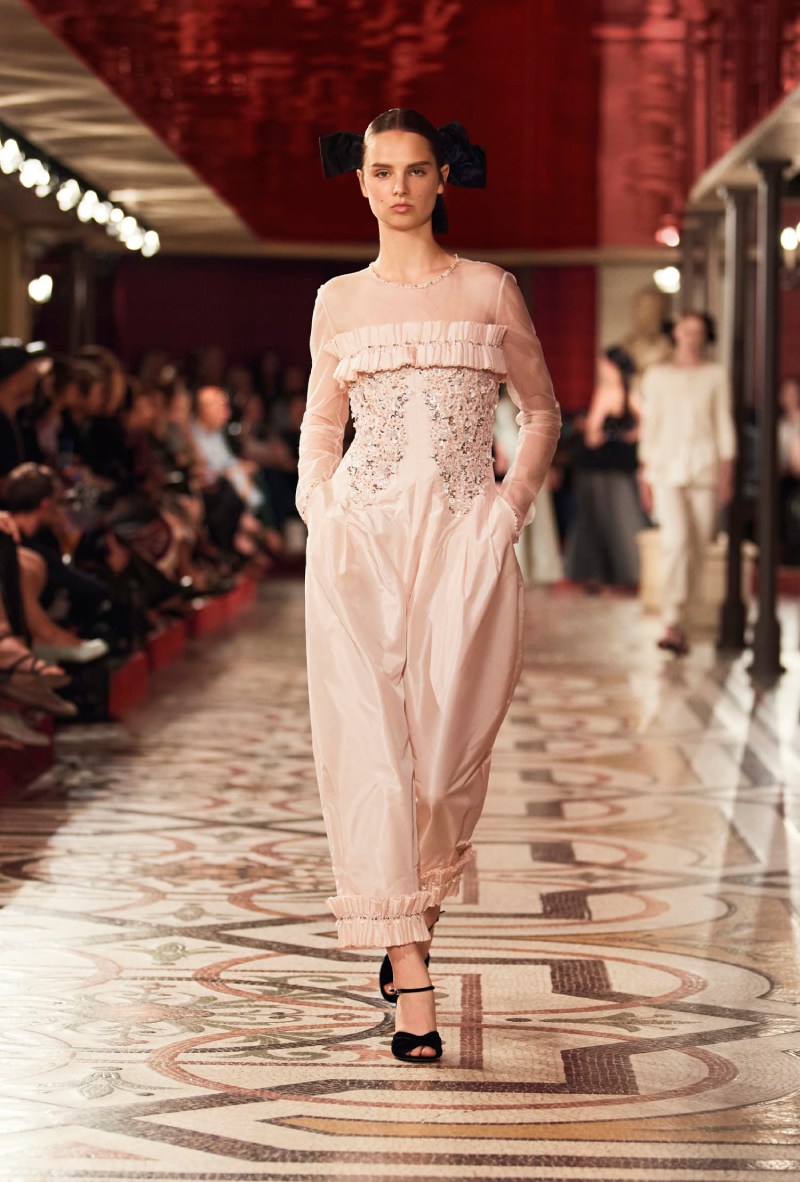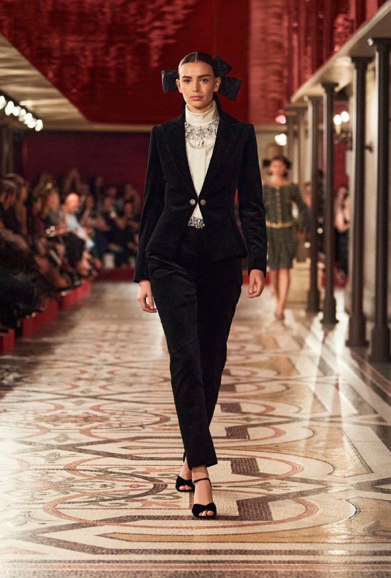 Y claro, los códigos emblemáticos de la maison se toman como pilares fundamentales para el relato. El traje de tweed, prendas masculinas y reinventadas y lazos, se enaltecen con el dramatismo del costume teatral, que aporta también un componente historicista y romántico bastante interesante.