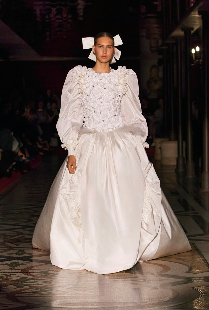 Este repertorio sigue con su componente de trajes de noche, delimitado por una delicada paleta de blancos rotos y rosas pálidos. Los conjuntos de este componente de Chanel Alta Costura Otoño-Invierno 2024/25 siguen rescatando guiños de época junto a toques de modernidad. Y como pieza a destacar, tenemos un top corsetero y estructurado, acompañado de una copa con volantes. Lo que cierra la colección es una procesión de vestidos negros con aún más referencias al tutú, que culmina con un abrigo sobreproporcionado y dramáticamente voluminoso. El vestido bridal, rescata estos volúmenes con mangas abullonadas y fruncidas y un cuerpo de flores.