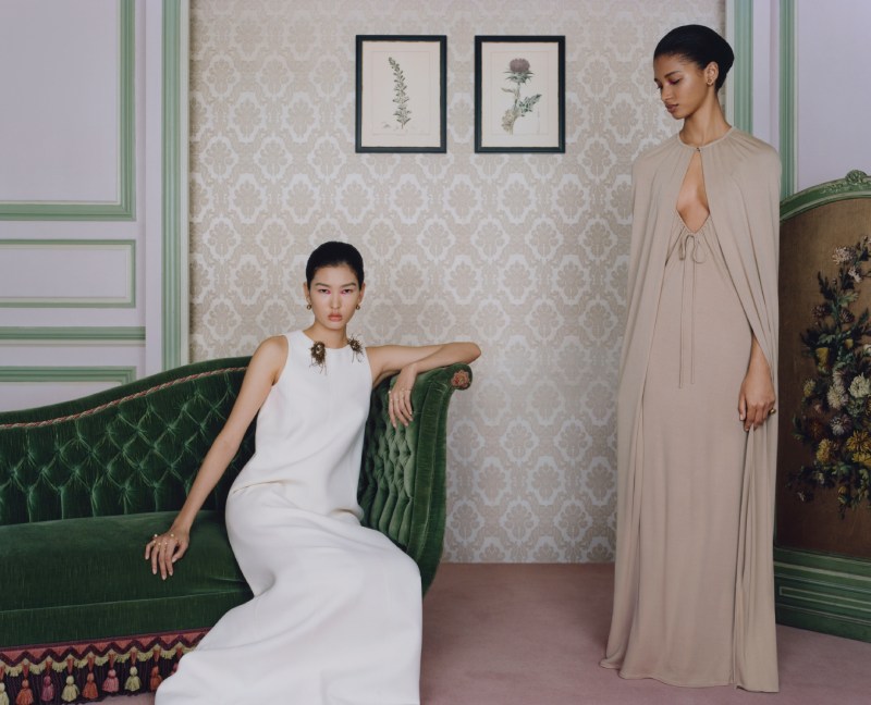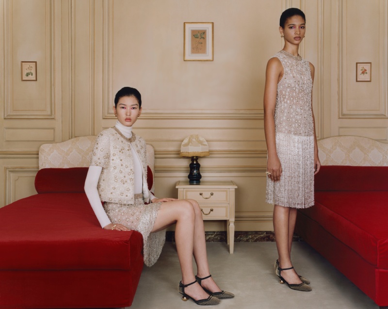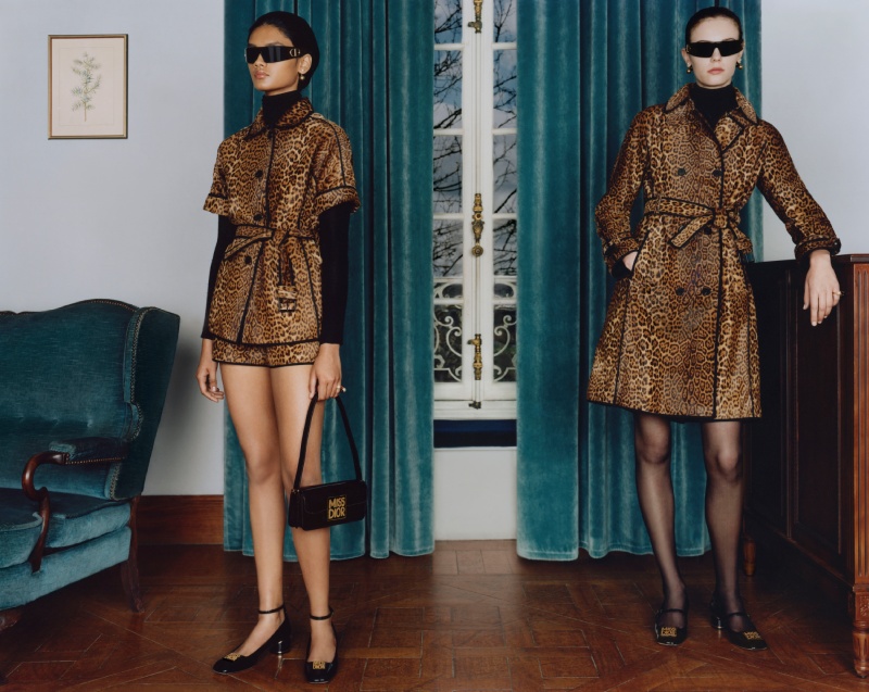 Pero no todo se queda en essentials. La nueva colección inspirada en Miss Dior mira a aquellos tiempos con conjuntos con estampados de leopardo. Chiuri nos propone prendas de cortes nostálgicos y ultra clásicos con un print mucho más pequeño en cuanto a dimensiones, pero no en extensión. También, el denim cobra muchísima importancia al crear looks más casuales, pero igual de elevados. Y para la noche, aquellos cortes cuadrados y boxy de los 60 vuelven con nuevos aires y ornamentaciones más elevadas con un repertorio de vestidos de eveningwear.