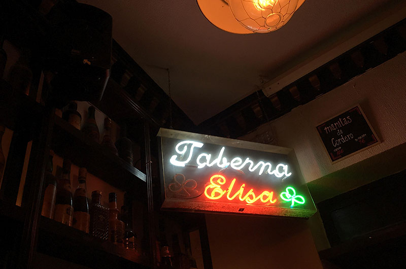 Azulejos con citas tabernarias. Barra de madera. Faroles y taburetes. Botellas antiguas. Aperitivo. Cocina castellana. Madrid acabado en zeta. A La Elisa no se puede ir con jaqueca ni migraña. El ambiente se carga a voces, porque la taberna que se imposta es insufrible de cursi. Se tiran cañas Mahou. Se ventilan buenos vermús. Los platos del día se pasan a pizarra. Los camareros corren y sudan. Se ríe y se vuelve a vocear, se come a dos carrillos.