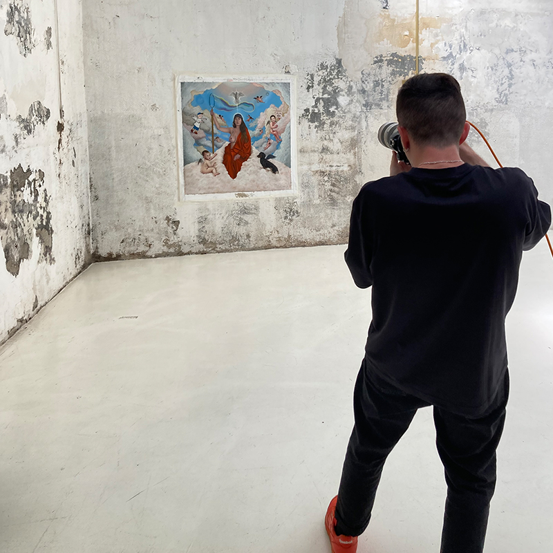 Pedro vive en un recóndito rincón de Cantabria, Pechón. Este condicionante sumado al factor del poco tiempo con el contábamos convirtió el proceso en una aventura. El servicio de mensajería allí es muy limitado y necesitábamos un servicio exprés de entrega en 24 horas. Pero lo que ocurrió es que la pieza, que viajaba en un tubo infinito, salió de su destino on time pero con unas paradas con las que nadie contaba. Primero, se extravió para llegar a Vitoria y, dos días más tarde, cuando ya debía estar publicada, llegó a Zaragoza. Mientras, Pedro Márnez, quién nos iba a disparar la foto de la pieza no paraba de hacer malabares con sus trabajos y su espacio de trabajo hasta que el cuadro apareciera. Y apareció y llegó a Madrid, donde trabajaríamos en la postproducción y todo el diseño gráfico. El trabajo ha tenido una peculiaridad, y es que lo hemos pintado físicamente buscando un tratamiento real que fuera lo más fiel posible a un fresco.
