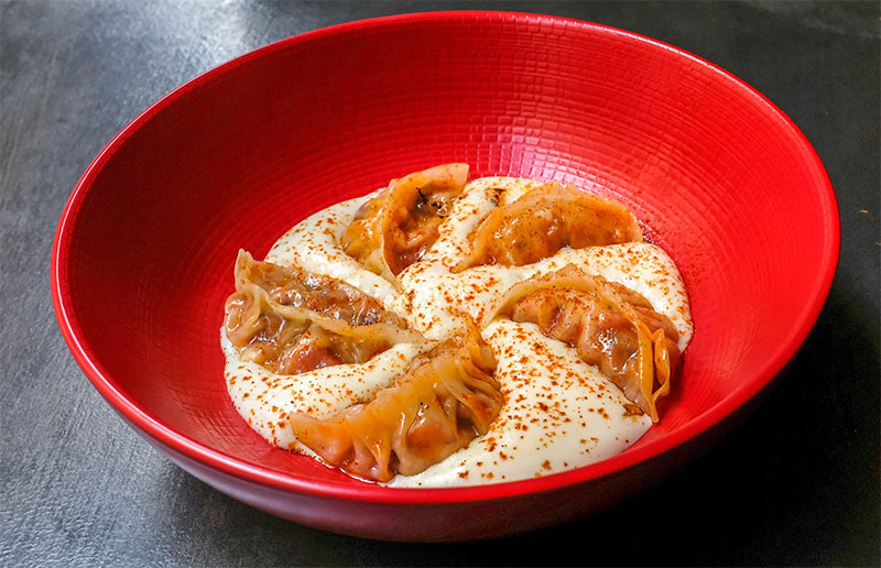 Imágenes superiores: empanadilla de chipirón en su tinta y gyozas de La Falda