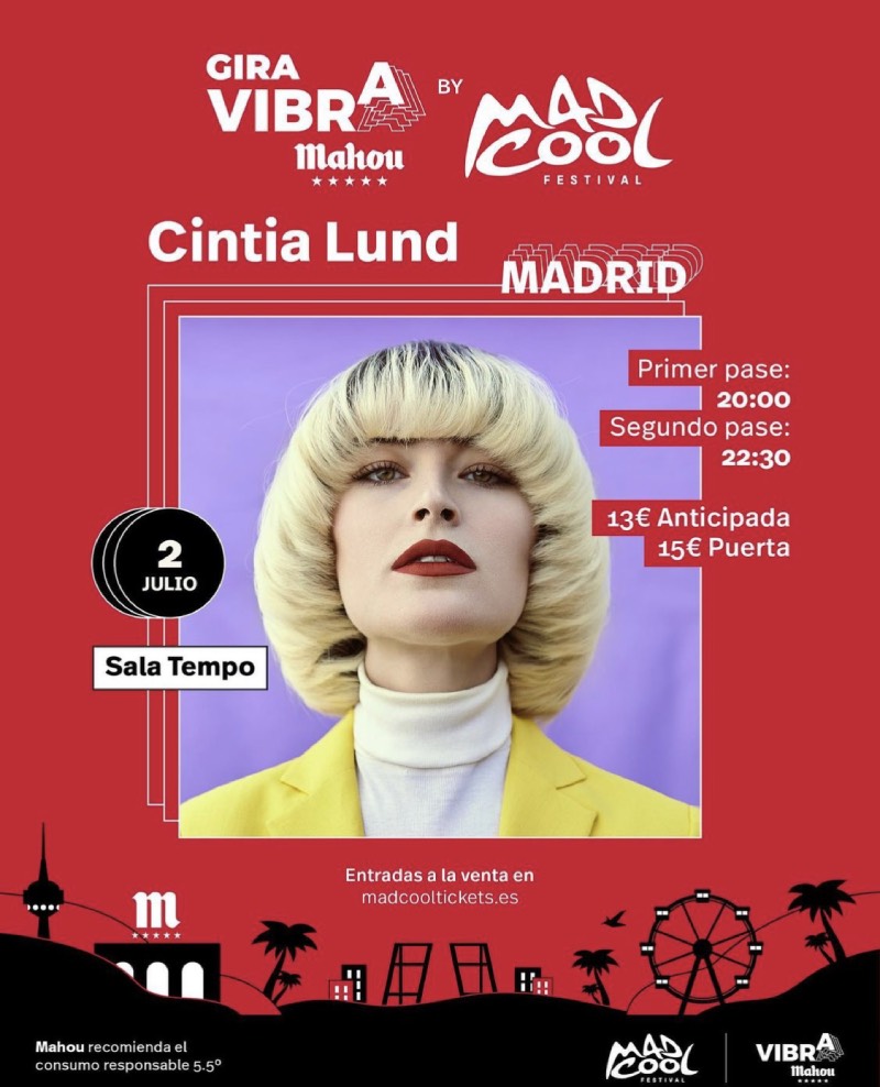Y en Gira Vibra Mahou by Mad Cool no podía faltar el eclecticismo de Cintia Lund que llegará a la Sala Tempo el 2 de julio. La artista canaria ha vivido en Nueva York, Estocolmo y Madrid. Debutó en el 2017 con su disco ‘New York Anthem’, en el que muestra su cara más arty y su fascinación por el artista Andy Warhol. De cara a su próximo trabajo, Cintia Lund nos sorprende con música en español en singles como ‘Aquí en Madrid’, ‘Guíame’ o ‘La Bola de Cristal’, donde se acerca al indie castizo y al pop ochentero, estilos que no nos pueden gustar más.