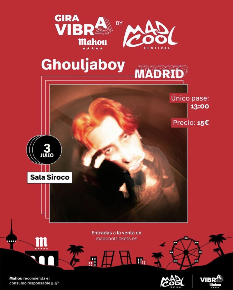 La guinda del pastel de esta edición de Gira Vibra Mahou by Mad Cool la pondrá Ghouljaboy el 3 de julio en la Sala Siroco. El trabajo musical de Jordi Arroyo es el resultado que conforma una especial unión entre un background post punk e indie pop y las tendencias urbanas más heterogéneas. Ghouljaboy es un compositor compulsivo que se dio a conocer en 2019 con el álbum ‘Corpse Party’, de 12 canciones. En 2020 lanzó‘El Rascal’, una colección de 18 temas en los que aparece acompañado por artistas como Antifan, Yung Beef, Pedro Ladroga o Absolute Terror, y, poco después, nos deleitó con ‘Ciudad Portuaria’, un trabajo dividido en dos volúmenes donde podemos encontrar temas tan icónicos como ‘Johny Rico’. Su trayectoria muestra una evolución en busca de un terreno donde coinciden el city pop, el dreamcore, los sintetizadores, la frescura, el autotune y los sonidos indies.