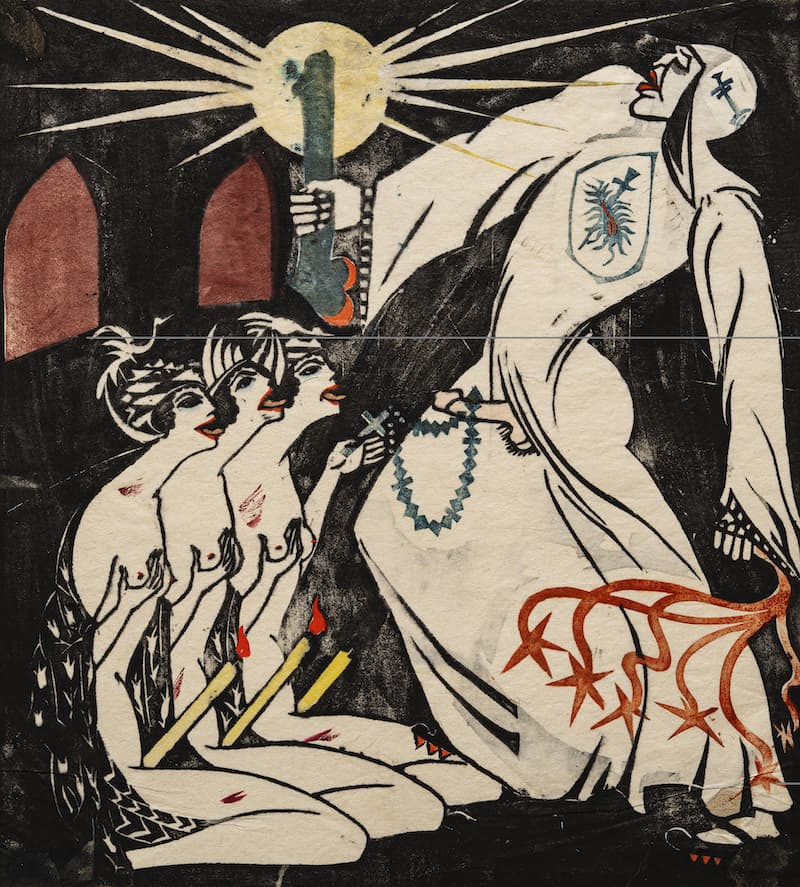 Izquierda: Marie Vassilieff, Peinture 2. Scène érotique, ca. 1930-1935. Collection Mony Vibescu. Cortesía de Alain Kahn-Sriber, París. Foto © Gilles Berquet. Derecha: Otto Dix, Scene II (Mord), 1922. Otto Dix Stiftung © VG Bild Kunst Bonn, 2023