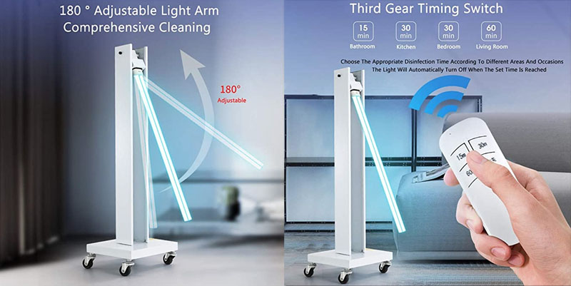 Esta lámpara, de diseño minimalista, tiene un tamaño de 120 x 120 x 428 mm y pesa solamente 500 gramos. Se compone de dos tubos emisores de luz que pueden desinfectar una habitación de 40 m2. Abarca los 360º, su base de es hierro y los tubos de vidrio (cuarzo). Para desinfectar un espacio de 10 m2 se necesitan 25 minutos, para uno de 20 m2 se necesitan 30 minutos y para uno de 40 m2 son necesarios 60 minutos. Su precio en Aliexpress es de 40,09€