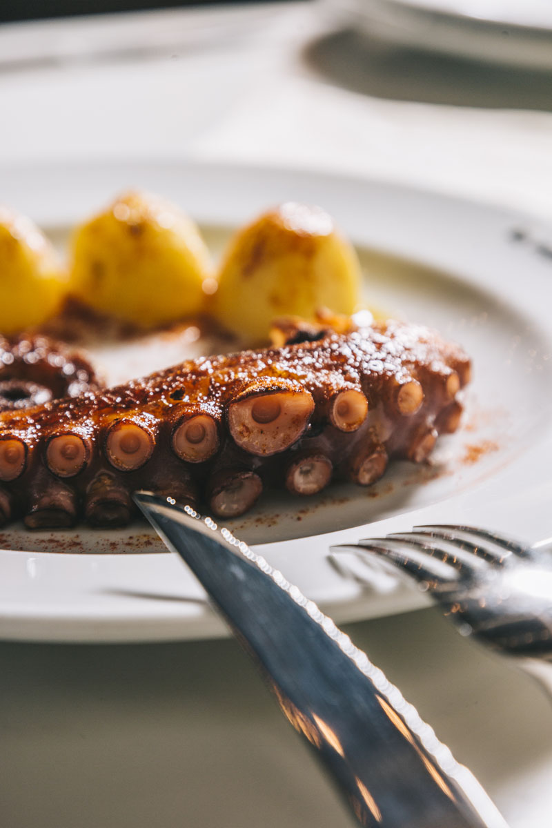 Imagen superior: Pulpo braseado con cachelos en La Mamona de Ponzano