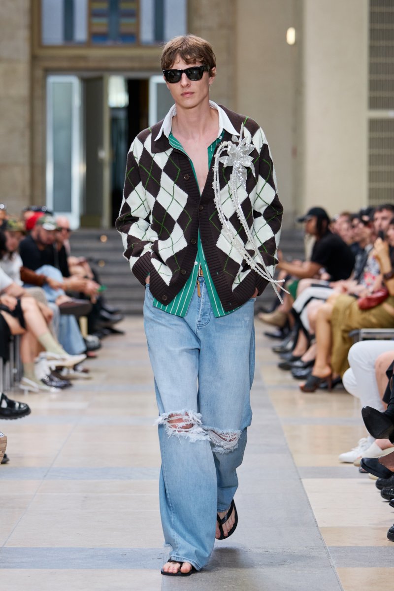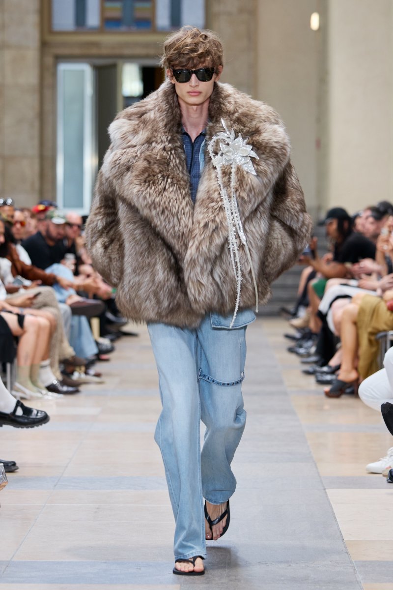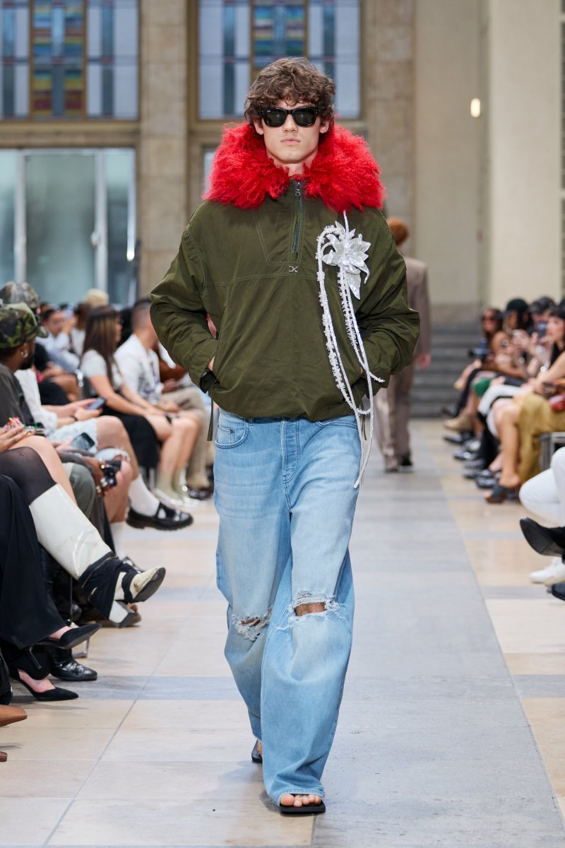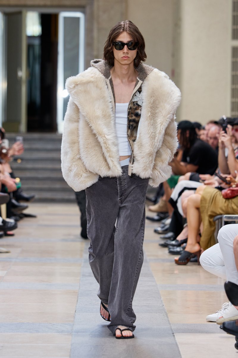 Las inspiraciones de Beckham y la obra de Miguel Ángel pueden verse delimitadas perfectamente dentro de David Koma ss26; así como los propios tropes del georgiano. Aquí, el arquetipo del futbolista se reinterpreta a través de las prendas más urbanas: jeans rotos de corte baggy, abrigos de pelo de proporciones exageradas, parkas, jerséis…