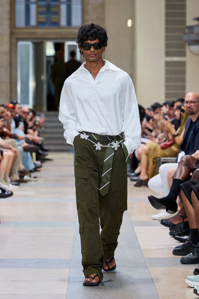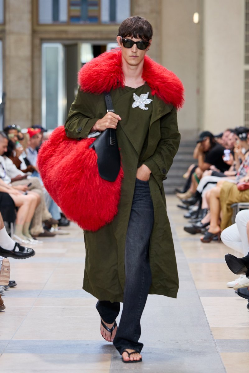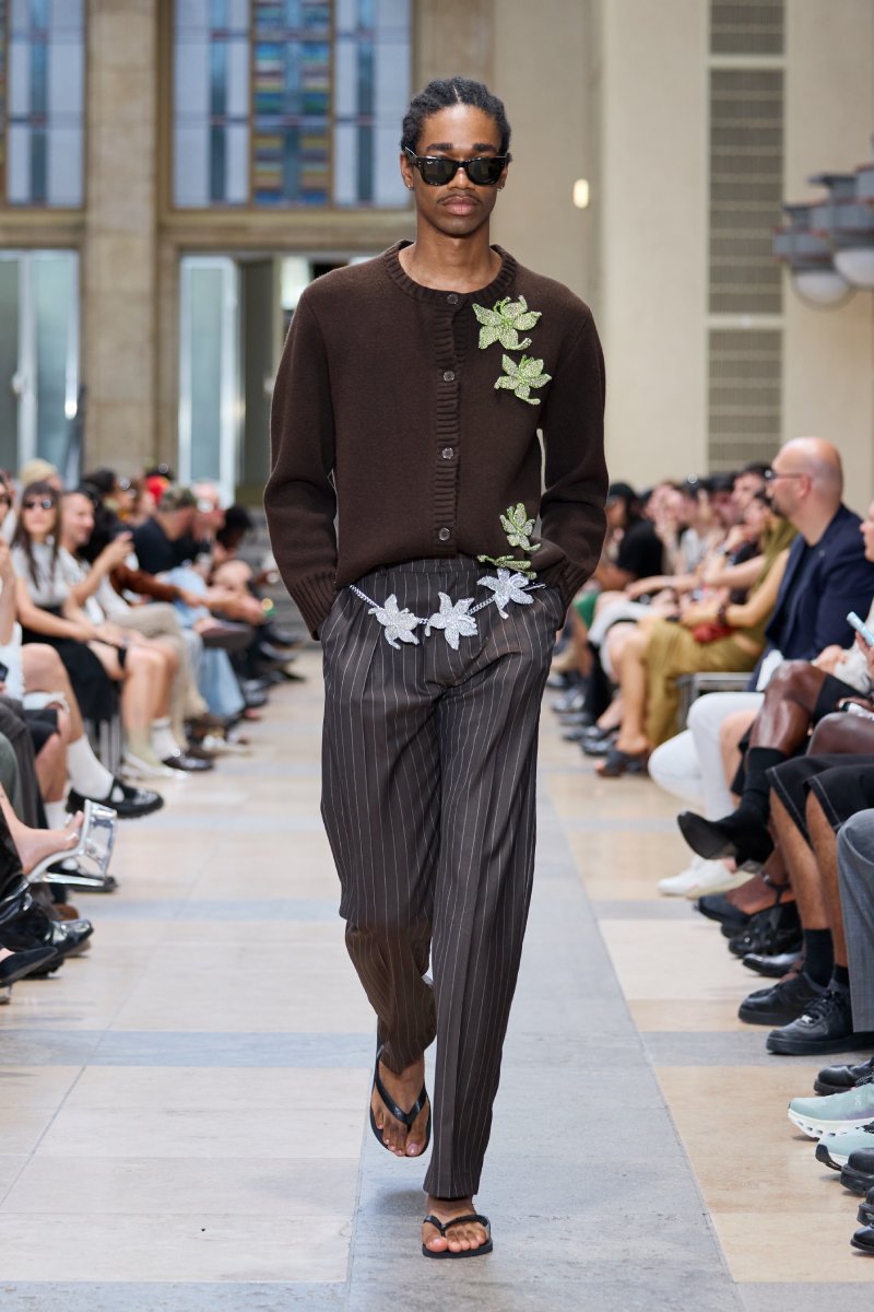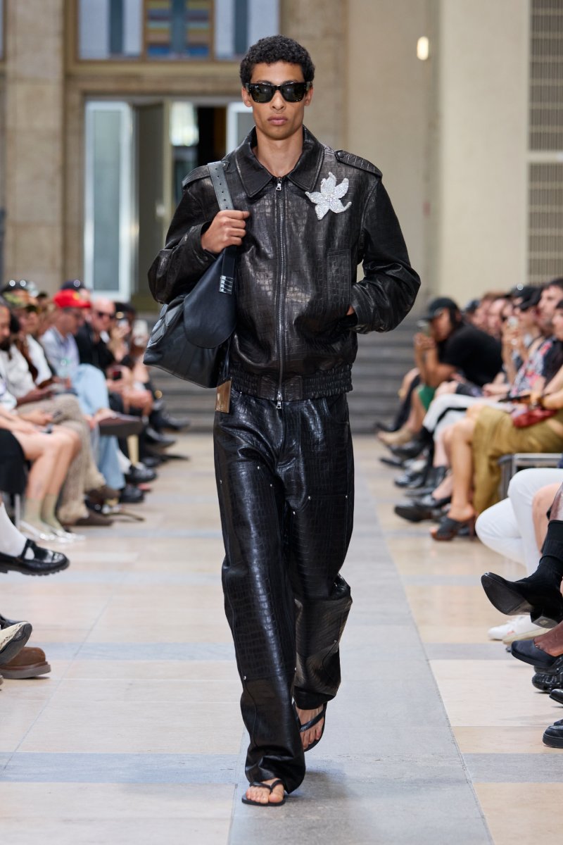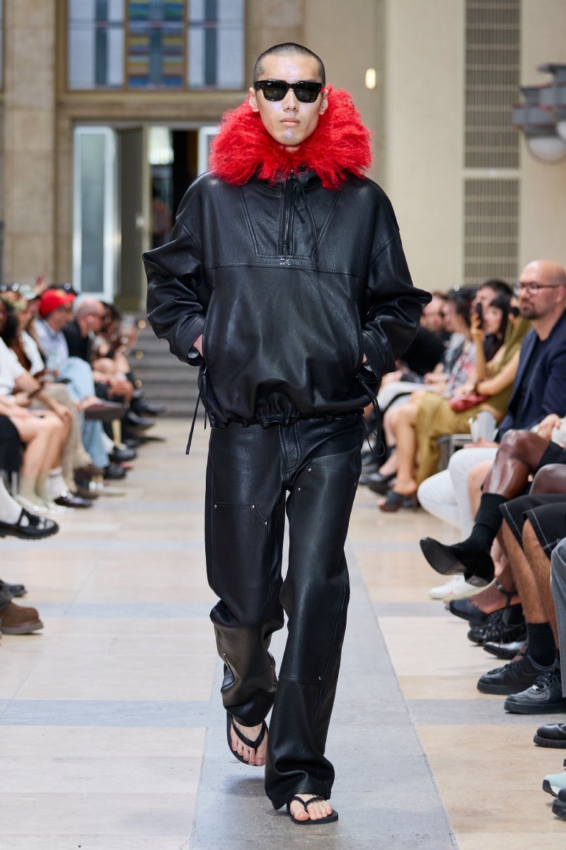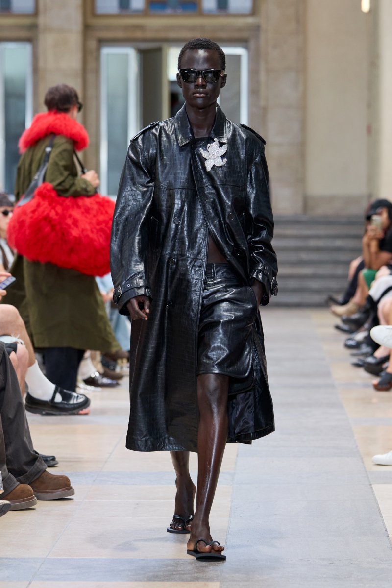 Ahora bien, ¿dónde está David Koma dentro de David Koma ss26? Su presencia es algo mucho más general. Lo podemos ver en prendas de inspiración militar perfectamente modernizadas; en trajes clásicos elevados con texturas y tejidos más interesantes (ojo con el de raya diplomática) y en los conjuntos de cuero, que convierten esenciales urbanos y clásicos en piezas declarativas. El lado de reinvención del menswear lo encontramos a manera de leit motifs: cuellos de pelo en colores estridentes, corbatas como cinturones. Ah, y claro, también está la idea recurrente de la flor de hibisco, que se plasma como bordado joya a lo largo de la colección (se inspira en los viajes veraniegos de Koma).
