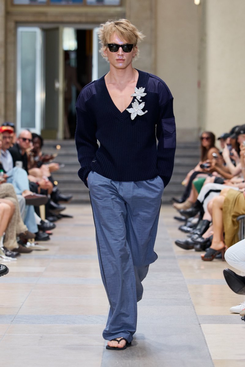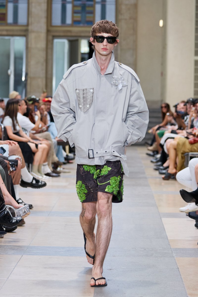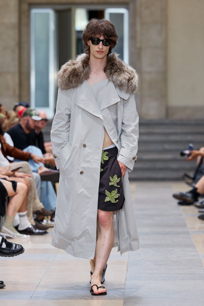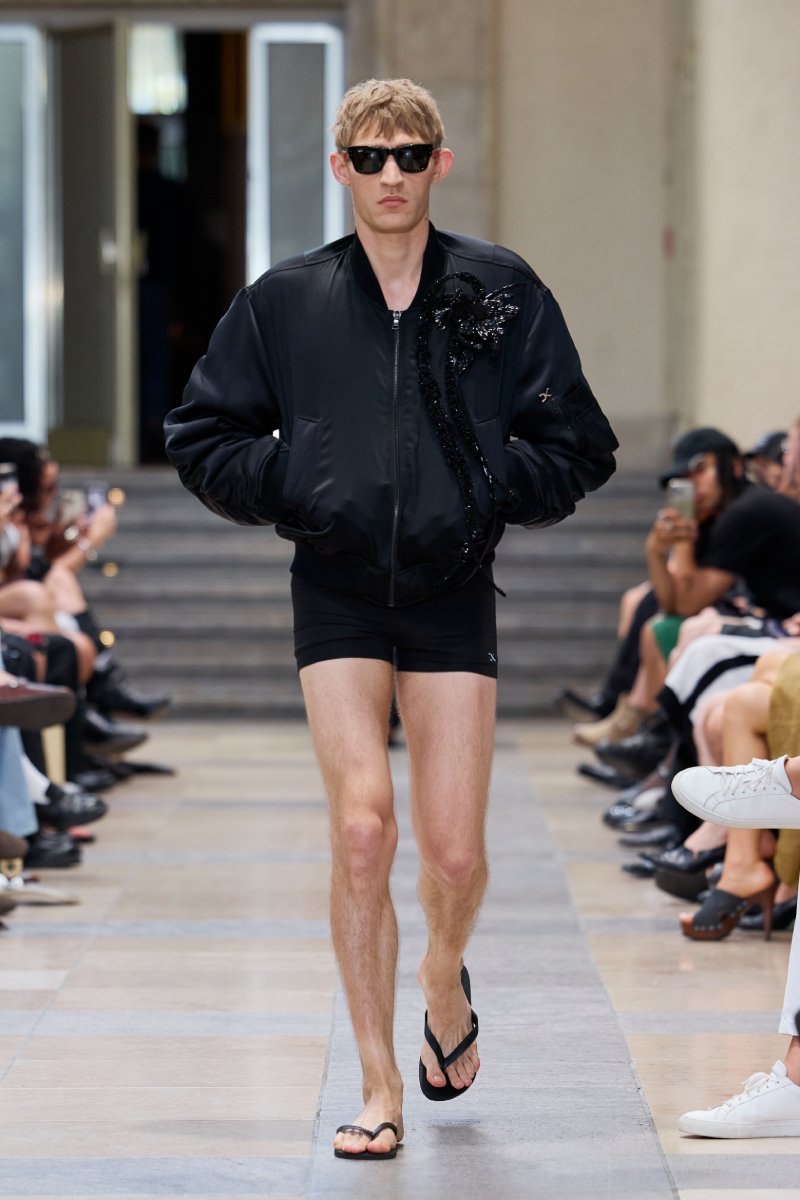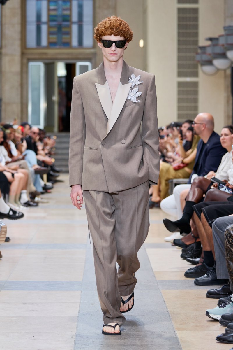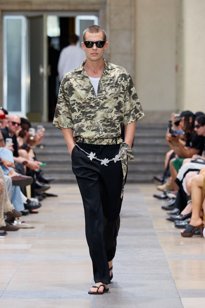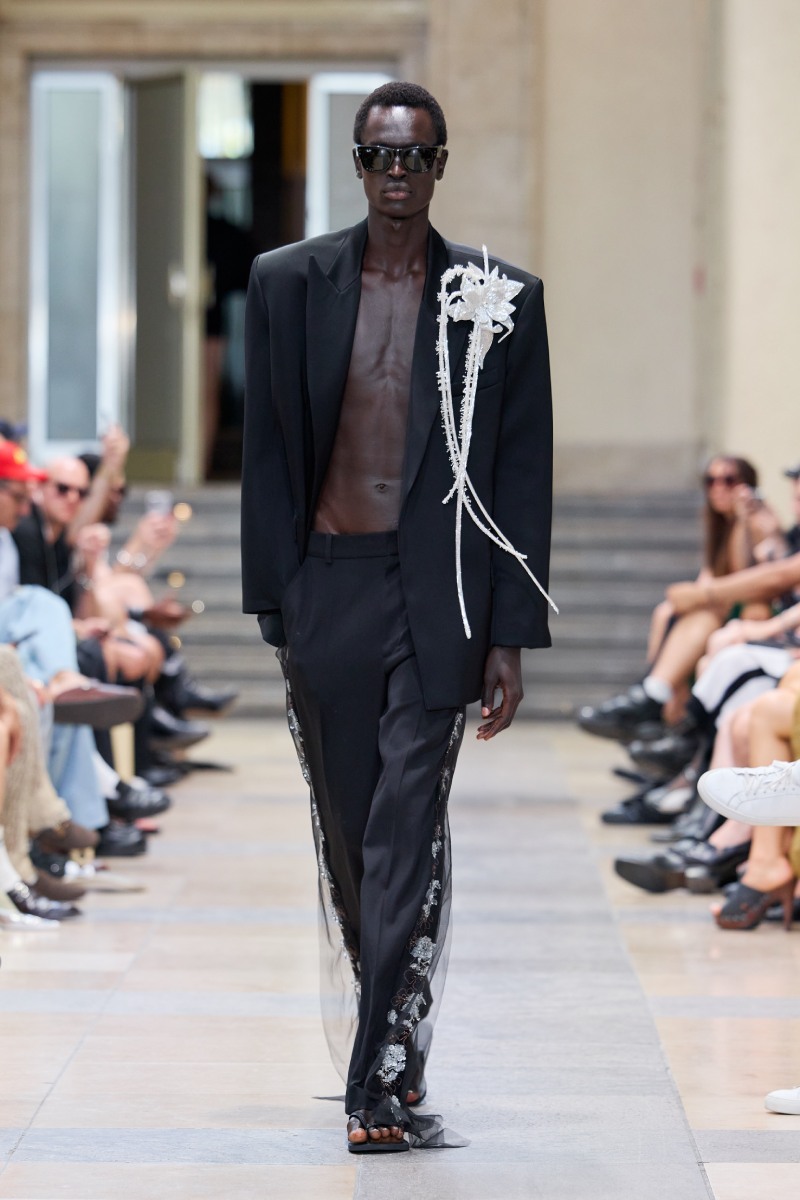 Ahora bien, ¿dónde está David Koma dentro de David Koma ss26? Su presencia es algo mucho más general. Lo podemos ver en prendas de inspiración militar perfectamente modernizadas; en trajes clásicos elevados con texturas y tejidos más interesantes (ojo con el de raya diplomática) y en los conjuntos de cuero, que convierten esenciales urbanos y clásicos en piezas declarativas. El lado de reinvención del menswear lo encontramos a manera de leit motifs: cuellos de pelo en colores estridentes, corbatas como cinturones. Ah, y claro, también está la idea recurrente de la flor de hibisco, que se plasma como bordado joya a lo largo de la colección (se inspira en los viajes veraniegos de Koma).