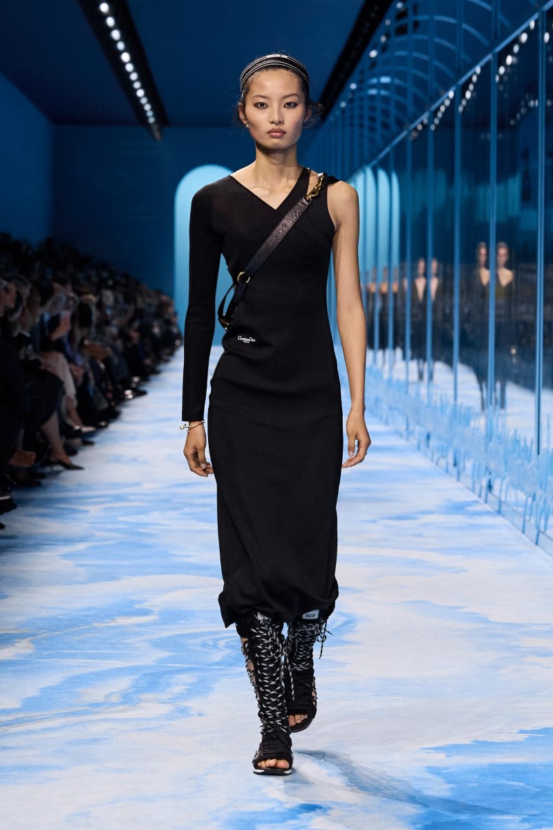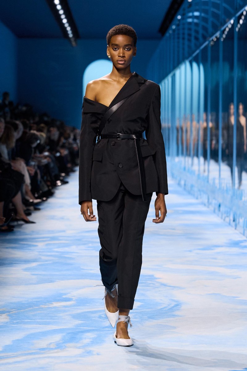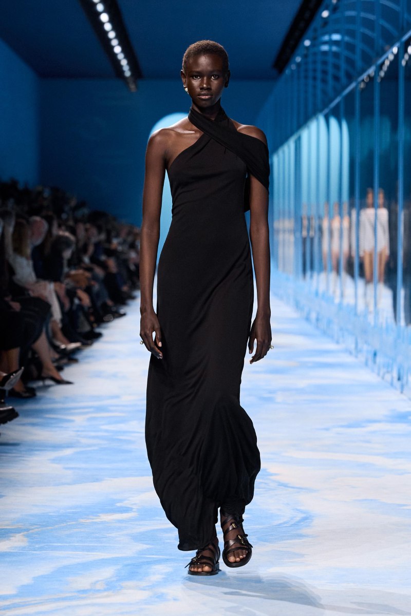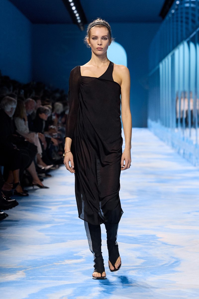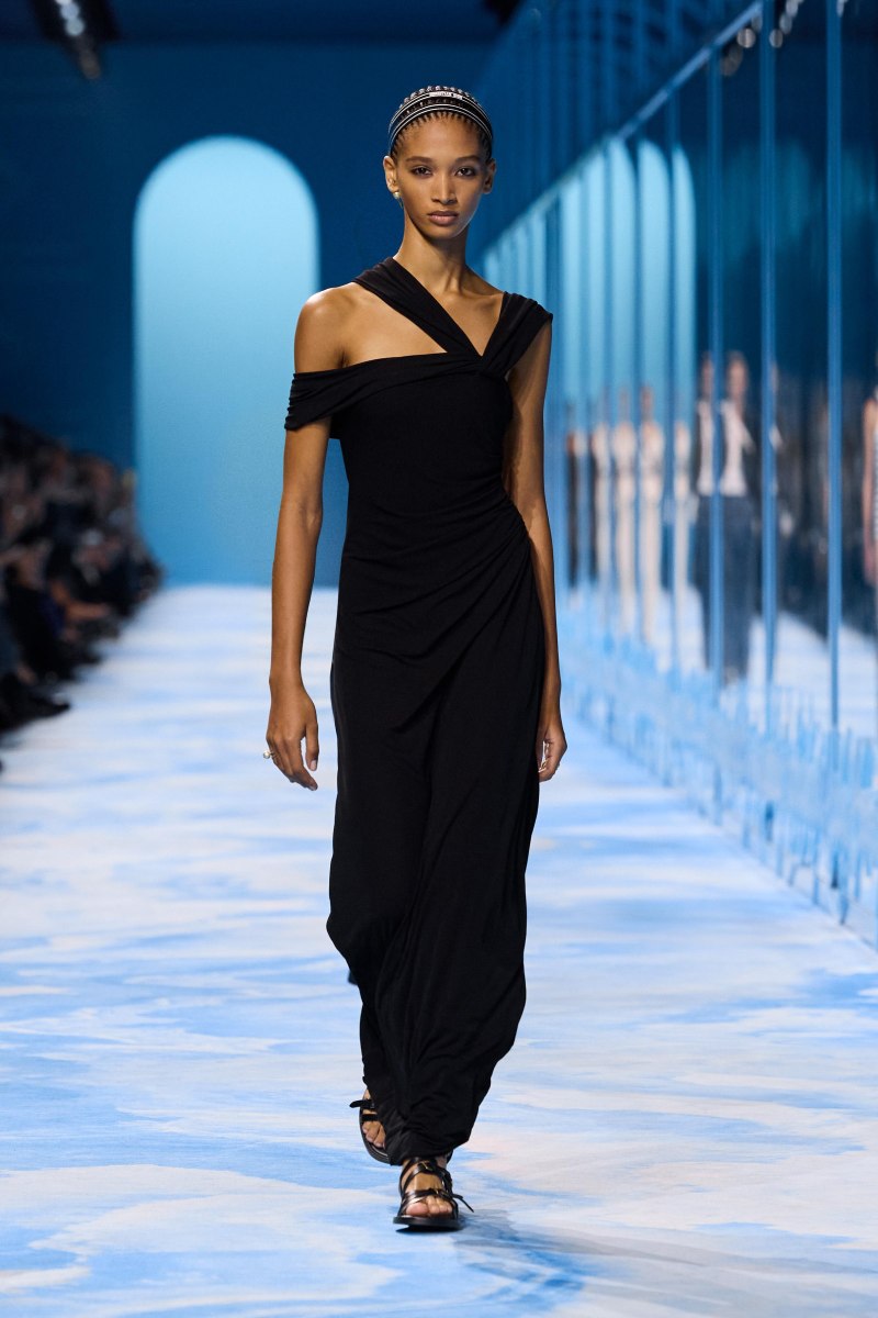 La colección de Dior Mujer SS25 no es como nada que hayamos visto de Chiuri. Es mucho más joven y fresca que antes; pero no deja de ser incuestionablemente chic. Esta nueva estética abre con una serie de vestidos y conjuntos pegados al cuerpo que resaltan la figura a través de cortes atrevidos; y claro, todos en negro. Este nuevo lenguaje se traduce también a prendas de outerwear de hombros caídos y vestidos más formales. Un rasgo en común es el trope de dejar un hombro al descubierto y una silueta asimétrica. Luego, tenemos algo más propio de Dior, pero que no se aleja demasiado de este mood.