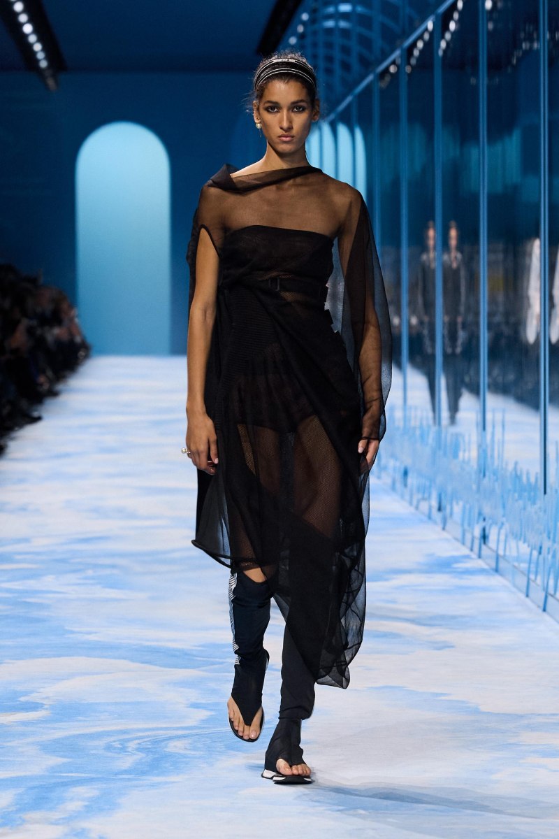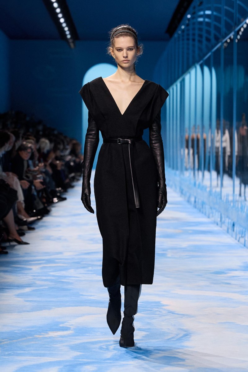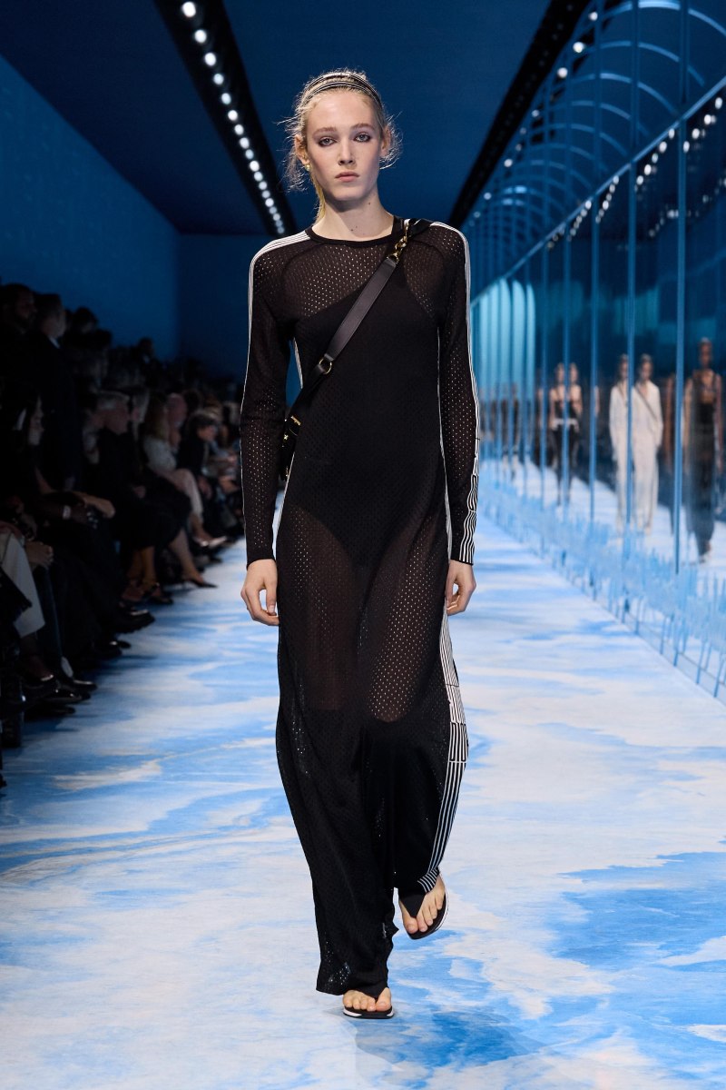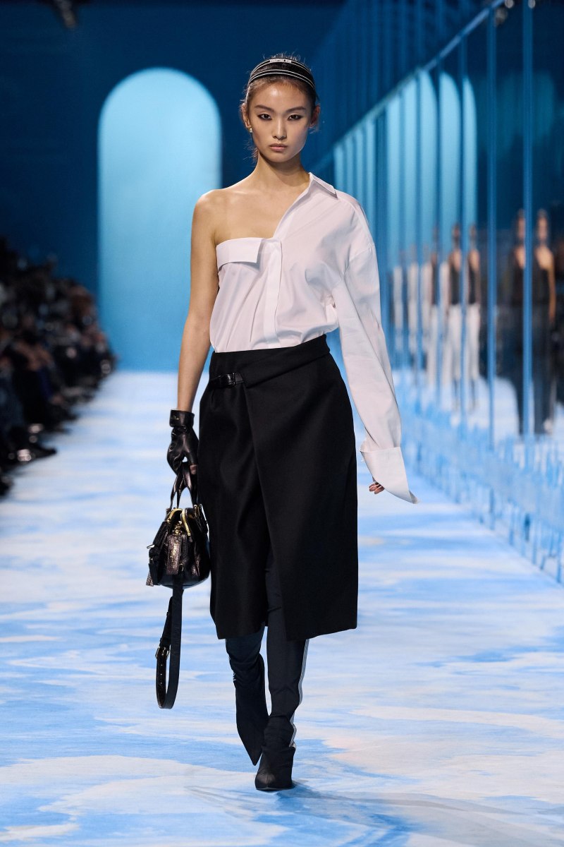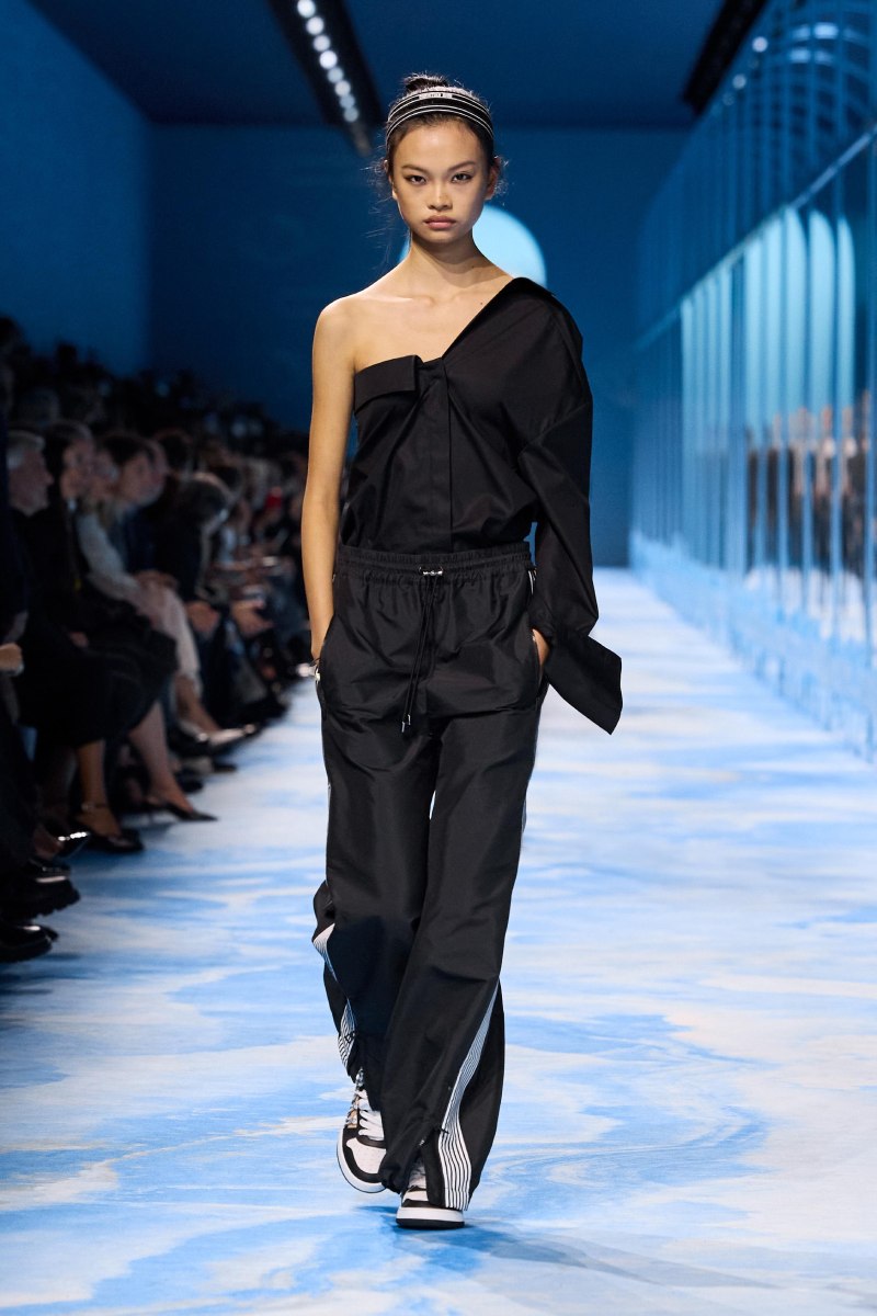 La colección de Dior Mujer SS25 no es como nada que hayamos visto de Chiuri. Es mucho más joven y fresca que antes; pero no deja de ser incuestionablemente chic. Esta nueva estética abre con una serie de vestidos y conjuntos pegados al cuerpo que resaltan la figura a través de cortes atrevidos; y claro, todos en negro. Este nuevo lenguaje se traduce también a prendas de outerwear de hombros caídos y vestidos más formales. Un rasgo en común es el trope de dejar un hombro al descubierto y una silueta asimétrica. Luego, tenemos algo más propio de Dior, pero que no se aleja demasiado de este mood.