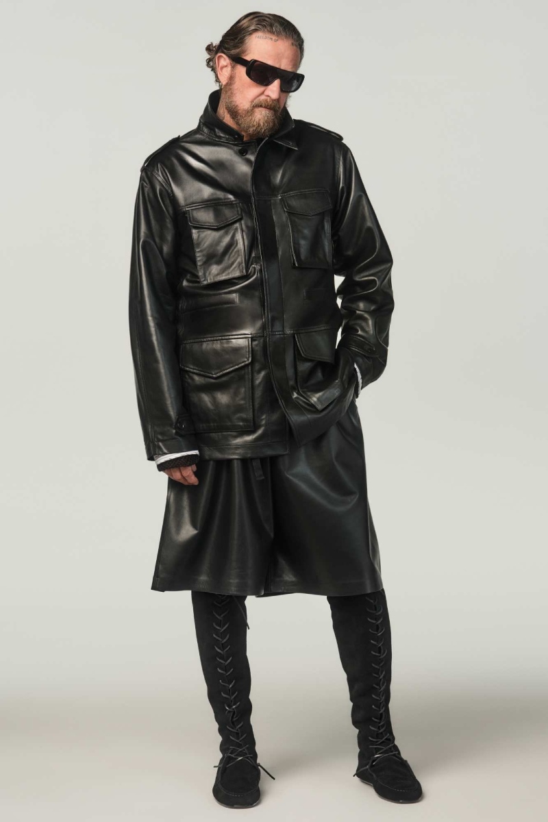 En el terreno masculino, la colección de Stefano Pilati X Zara apuesta por sastrería y menswear tradicional, pero con un twist. Más allá de los cortes oversize, vemos cómo elementos de estética punk se meten a la mezcla, como con esa bomber de ojales metálicos o esa falda de cuero. En estos looks, seguimos viendo camisería de inspiración romántica en negro como elemento fundamental. Y bueno, los vaqueros de corte baggy serán un must esta temporada tanto por el corte como por sus acabados. Como piezas estrella, destacamos también un chaquetón XXL, una americana acolchada y la M-65 de piel negra.