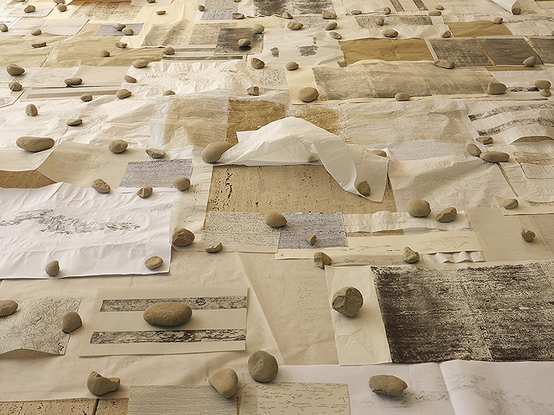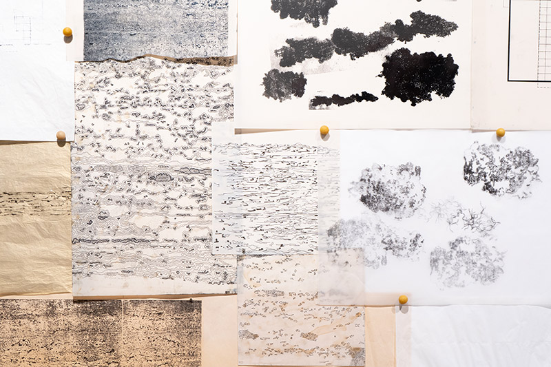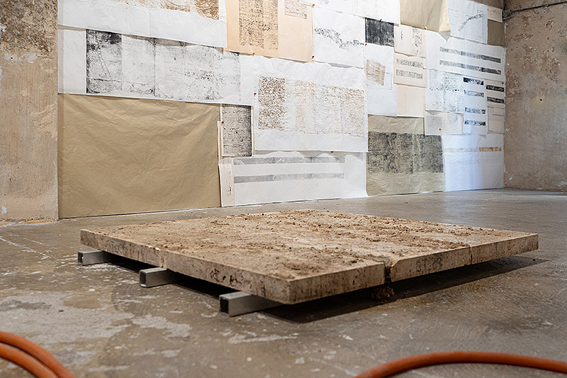 Además de la losa, “La Preñada” incluye más de 100 litografías colgadas en el primer ámbito de la galería. “Desde la calle y en un primer ámbito de la galería Fuga, cuelgan de las paredes más de 100 litografías realizadas juntamente con las estudiantes. A partir del dibujo y redibujo de un único fragmento de travertino del pabellón, se analizan y especulan sus relaciones como material bio-geológico, estructura y relación con el agua”, explican.