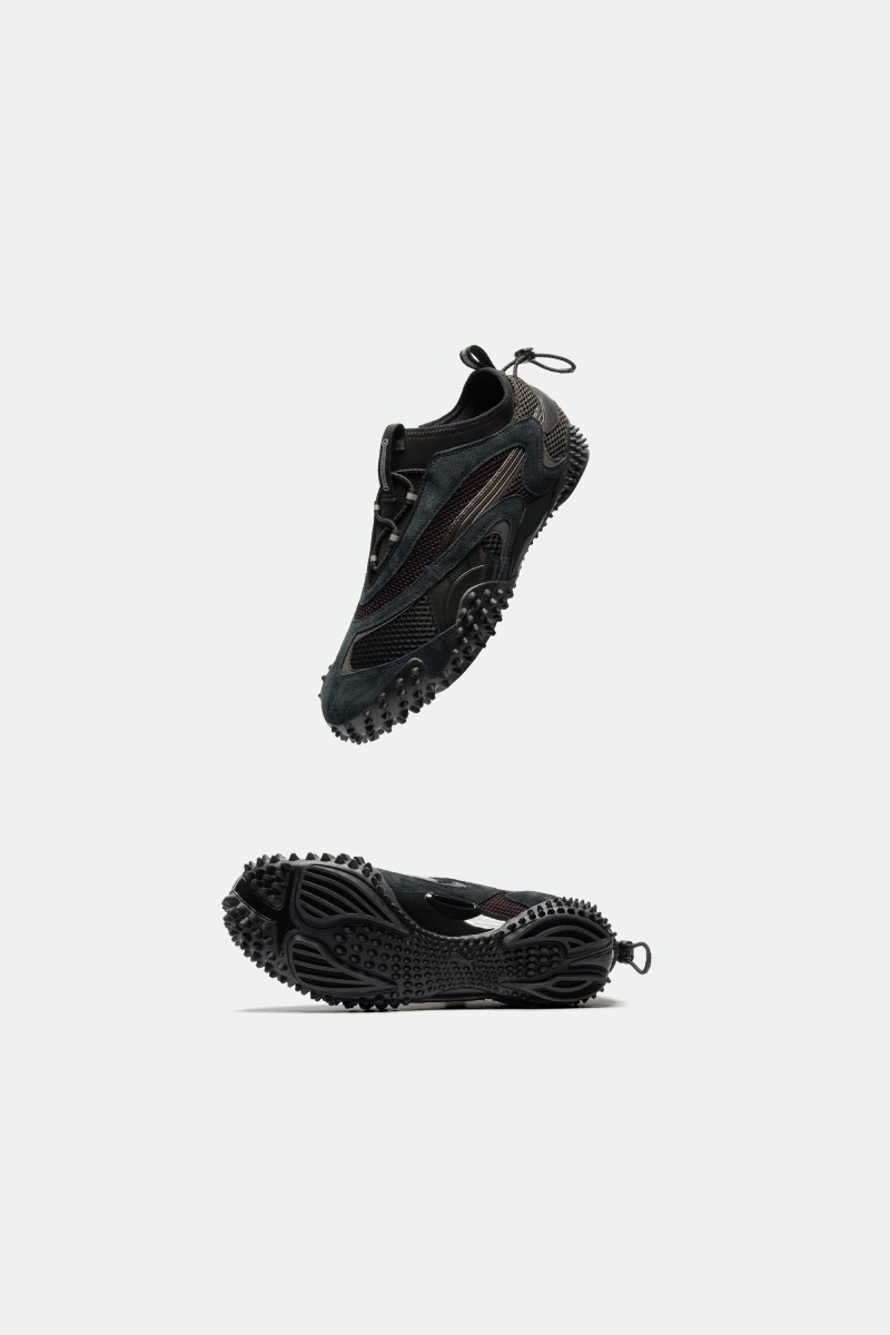 Abriendo este capítulo colaborativo de Puma X Aries, la firma de high street londinense interviene algunas de las siluetas más icónicas y tendencia de Puma. En primer lugar, tenemos unas nuevas Mostro. Esta nueva versión subvierte la fórmula con un nuevo upper de ante, neopreno y malla con detalles utilitarios. También, el icónico cierre de correas se reemplaza por un sistema de cordones que se ajusta en el talón y tenemos un cuello elástico. Pero tranquilos, han dejado la suela de pinchos intacta.