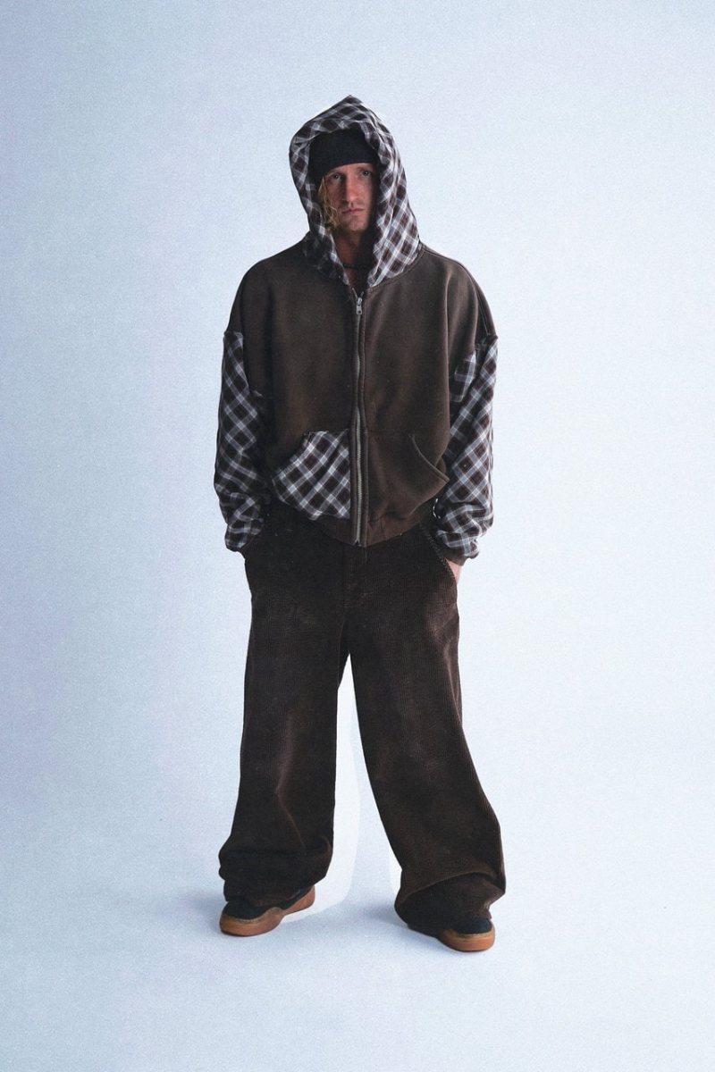 Completando este nuevo armario urbano y festivo de ERL Holiday, tenemos otros esenciales de aire nostálgico, pero ahora en patrones de tartán marrones y grises. Como highlights de estas prendas tenemos una sudadera patchwork de corte oversize, una camisa con mix de estampados y una camiseta Venice marrón con sus boxers a juego. Completando estos looks, tenemos pantalones vaqueros acabados en pana acanalada marrón de corte baggy en ambos largos. Y, como accesorios, calcetines brandeados y más boxers (estos con tartán rojo navideño).