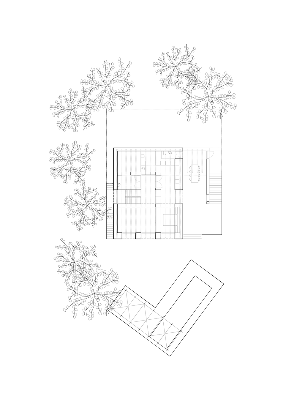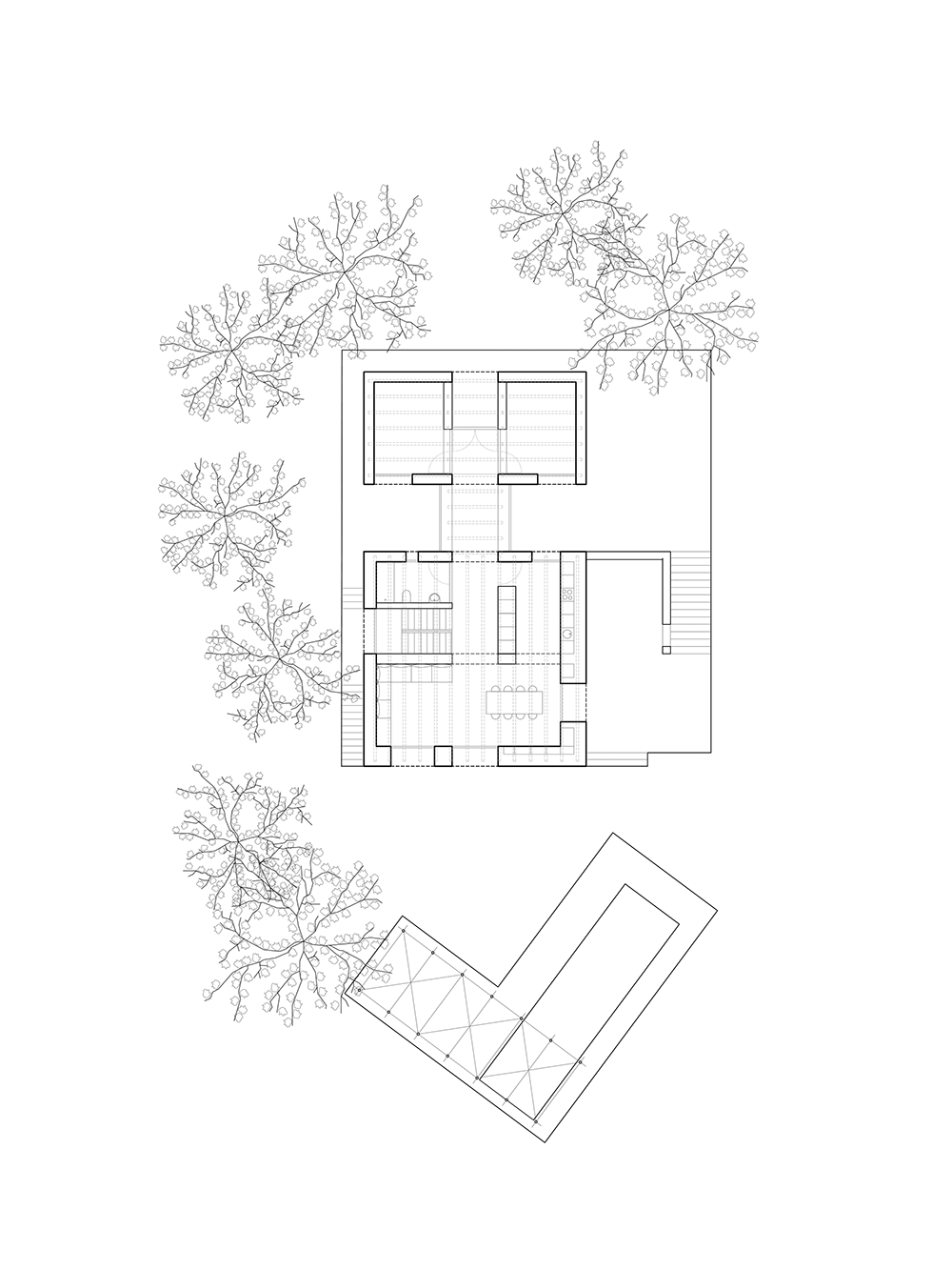 Con todo esto en cuenta, Hue Studio creó una retícula modular compuesta por tres rectángulos, colocados según dos criterios principales: la posición de los árboles y la orientación solar. De este modo, se consiguió combinar espacios amplios y conectados para la vida en común –como el salón, el comedor y la cocina– con otros más separados –los dormitorios–, que ofrecen mayor intimidad y facilitan posibles cambios en el uso de la vivienda en el futuro.