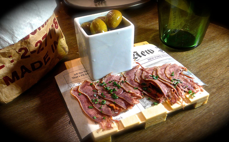 Si leyendo estas líneas ya has pensado que esto no es para ti, no estés tan seguro. Yo por ejemplo nunca había probado la lengua de ternera, solo el hecho de pensar en este plato me producía un gran rechazo. Probar el escabeche de lengua de ternera en forma de carpaccio que hacen en la Tasquería ha sido una experiencia extra sensorial. ¿Cómo describiría el sabor? Una especie de salchichón o lomo del norte de Italia o algo así pero con unos matices muy sutiles y delicados.