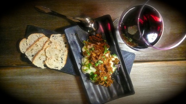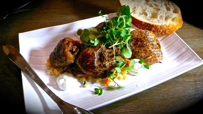 Arriba: Impresionante otro de sus entrantes son las alitas de pollo sin hueso con cus cus y ali oli.