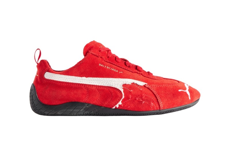 Al basarse solo en tropes icónicos y característicos, la oferta de calzado de Balenciaga X Puma se centra también en un icono: las Puma Speedcat. Las versiones de esta colaboración se presentan desgastadas y casi destruidas, con uppers de ante ensuciados y decorados por un Formstrip arrancado. Como detalles especiales, se incluye el branding de la maison y su clásica suela de goma.