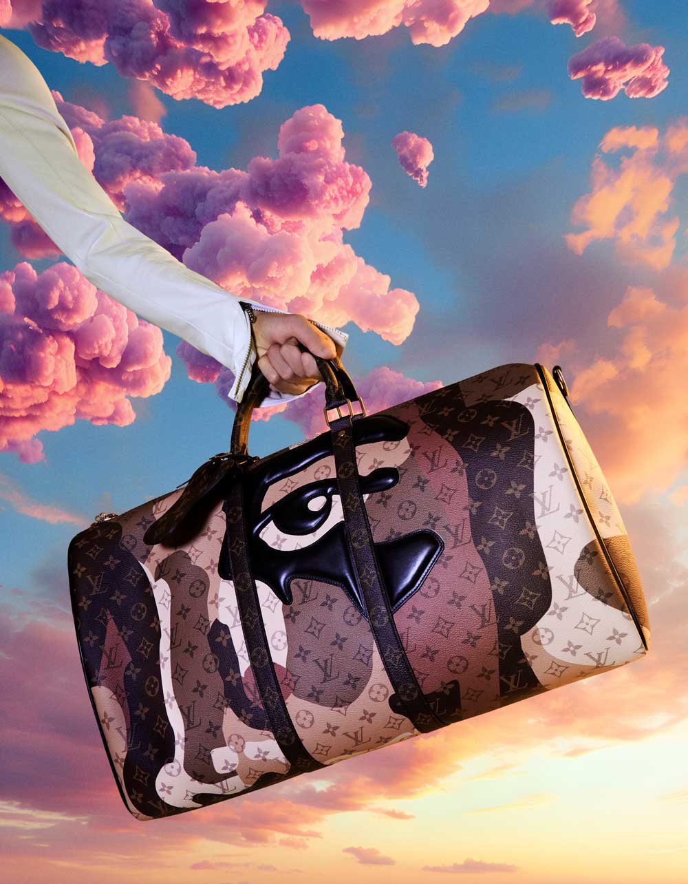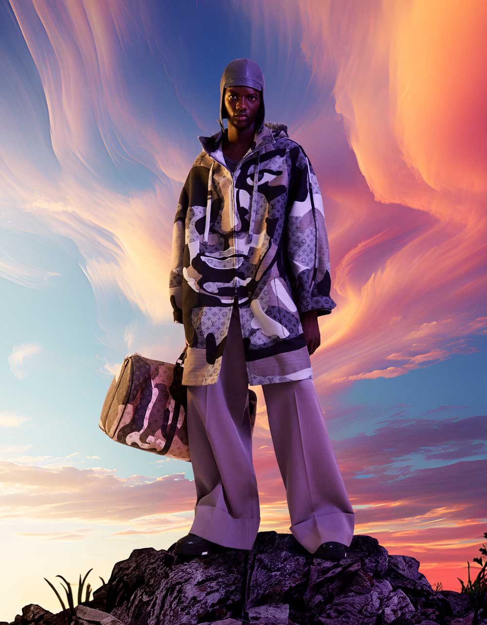 Arriba: Todo de LOUIS VUITTON FW23: Parka con retrato de patchwork, pantalón parachute de algodón, gorro de piloto, zapatilla deportiva LV Skate y bolsa de viaje Keepall