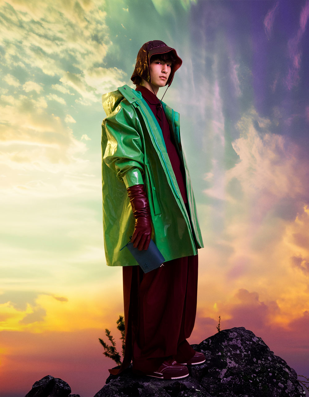 Look completo de LOUIS VUITTON FW23: Parka verde, americana anudada de lana, pantalón ancho de lana, guantes de piel, gorro de piel, zapatilla deportiva LV Skate y cartera Fastline con bandolera