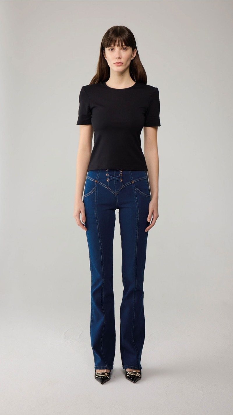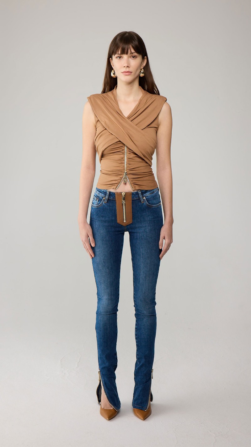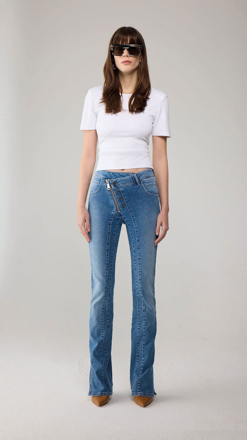 Y sí, la colección SS25 de Rhodaine está apostando fuertemente por la vuelta de los skinny jeans. Dentro de su catálogo, vemos el típico vaquero ceñido que llevamos hasta el cansancio, pero ahora actualizado con apliques en la cremallera, aperturas en los talones y construcciones de corset. En pocas palabras, vuelven los skinny, pero actualizados con toques más modernos.