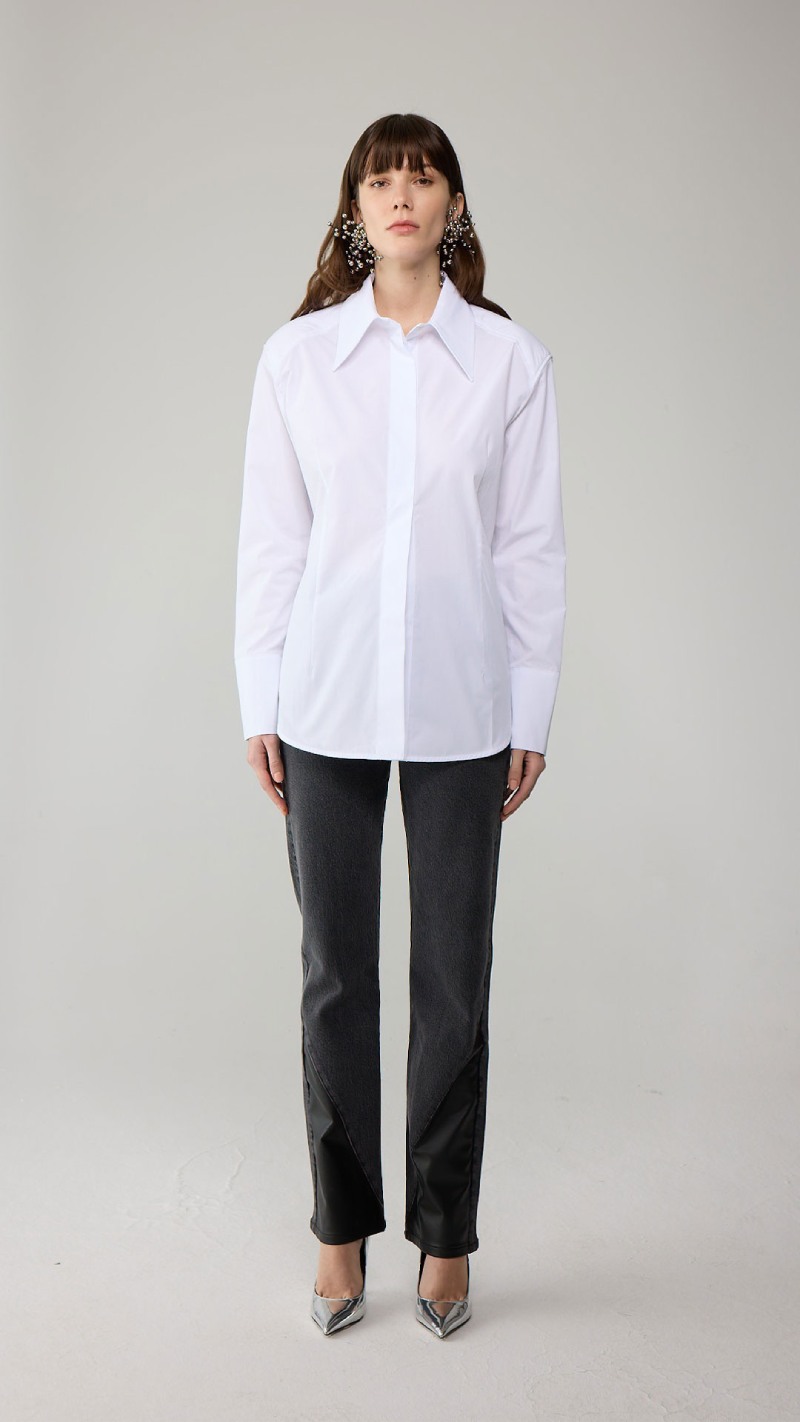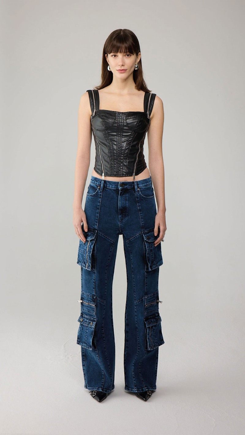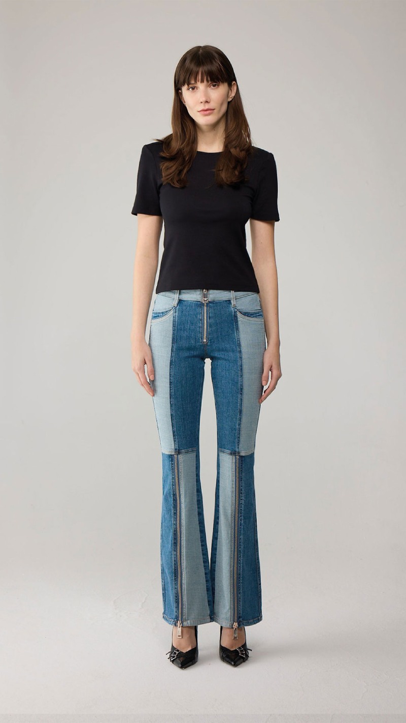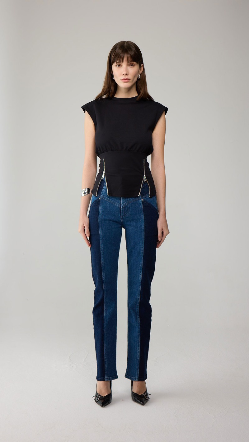 Y sí, la colección SS25 de Rhodaine está apostando fuertemente por la vuelta de los skinny jeans. Dentro de su catálogo, vemos el típico vaquero ceñido que llevamos hasta el cansancio, pero ahora actualizado con apliques en la cremallera, aperturas en los talones y construcciones de corset. En pocas palabras, vuelven los skinny, pero actualizados con toques más modernos.