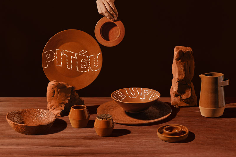 Pitéu (que significa “buena comida” en portugués) es un conjunto de platos decorados con una representación puntillista tradicional pintada a mano de elementos tipográficos.