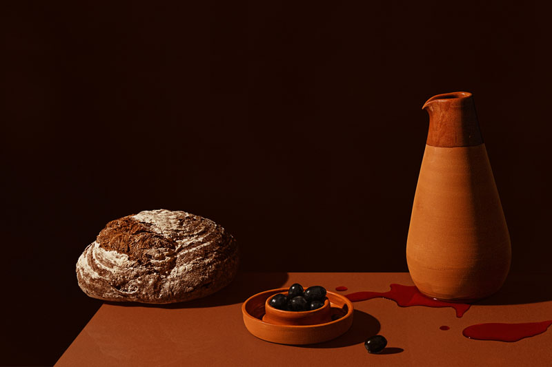 Bajouca es una jarra de terracota con personalidad propia que mantiene el agua o el vino frescos. La base es un plato pequeño para aceitunas, con un compartimento para arrojar los huesos.