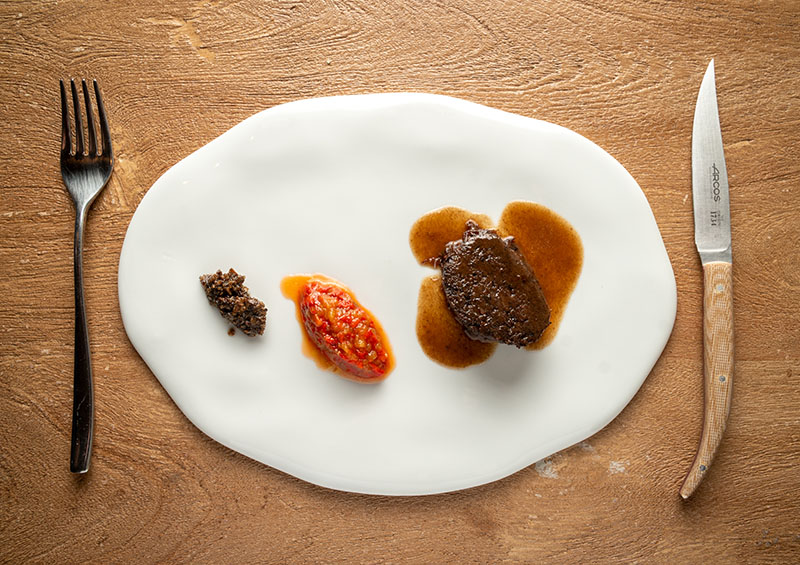 Carne de mercado, escalivada y duxelle de champiñon