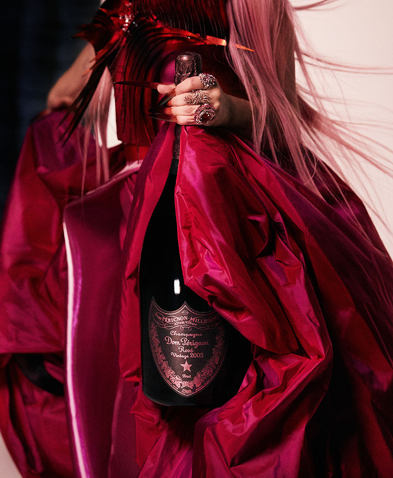 El objeto de deseo de esta colaboración es la botella de Dom Pérignon Rosé, como una representación de lo que significa tener libertad para explorar y para dejar de lado las convenciones y superar los límites de la creación. La uva pinot noir de la que se obtiene esta bebida captura su poder vital en un ensamblaje audaz y asertivo, atemperado por una lenta y magistral transformación durante casi 12 años en la bodega.