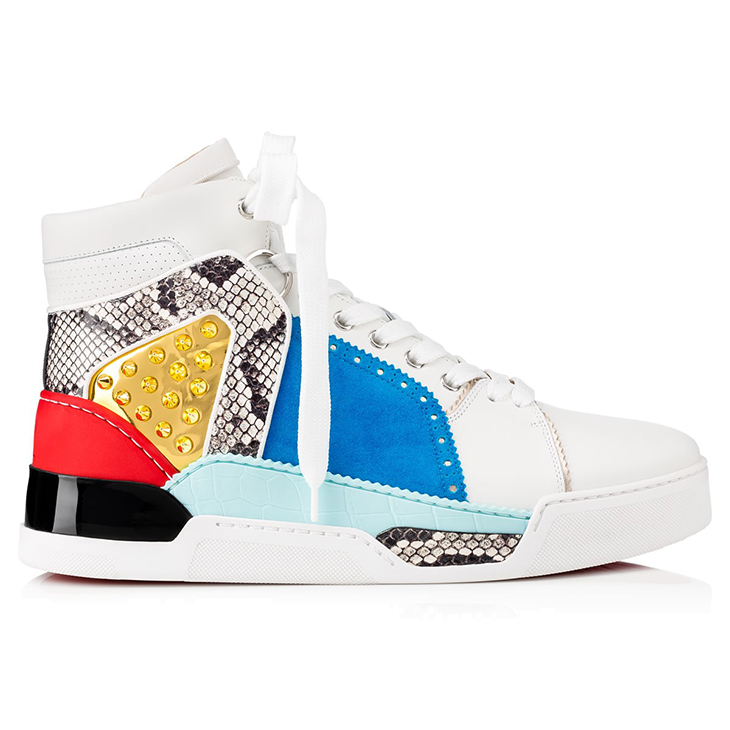 8.- Christian Louboutin. Nos tiene acostumbrados a calzados muy cargados pero en esta ocasión seleccionamos un modelo del zapatero francés que es una mezcla entre minimal y maximal con base blanca y patchwork de pieles, colores y tachuelas.