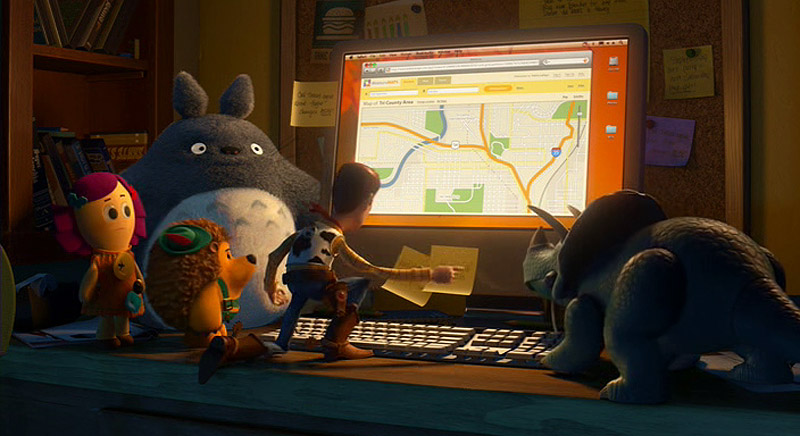 Es un fotograma de “Toy Story 3”: la tercera entrega (y para muchos, la mejor) de la saga de muñecos animados que empezó John Lasseter para Pixar. No es ningún secreto que Lasseter es un absoluto fan de Miyazaki, admirador de todas y cada una de sus películas. Por eso el fundador de Pixar se aseguró de que, entre los muchos muñecos que aparecen en “Toy Story”, apareciera también un muñeco de Totoro (en la foto, el segundo por la izquierda, junto al monitor del ordenador). Que en Pixar / Disney les rindan homenaje, da una idea de lo grandes que son Miyazaki y Ghibli.