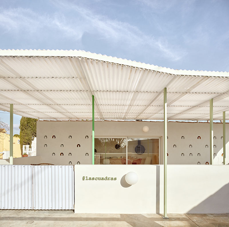 Originalmente, Las Cuadras contaba con una pequeña cubierta anclada a la fachada principal, ésta fue reutilizada. Estudio Ji la eleva sobre la nave principal y la sujeta a partir de finos pilares verdes. El conjunto recrea una especie de gigante árbol de policarbonato y hierro que deja pasar la luz, da sombra y logra que el aire circule y refresque en verano el porche de entrada.