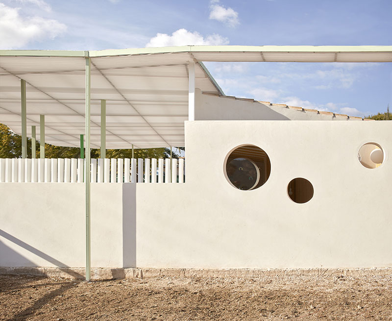 La pared principal de Las cuadras observada desde el este muestra un patio inglés amarillo con una serie de aperturas que miran al campo. Y desde el lado norte, Las Cuadras de Estudio Ji cuenta con unos huecos circulares de ventilación que actúan como lámparas retroiluminadas.