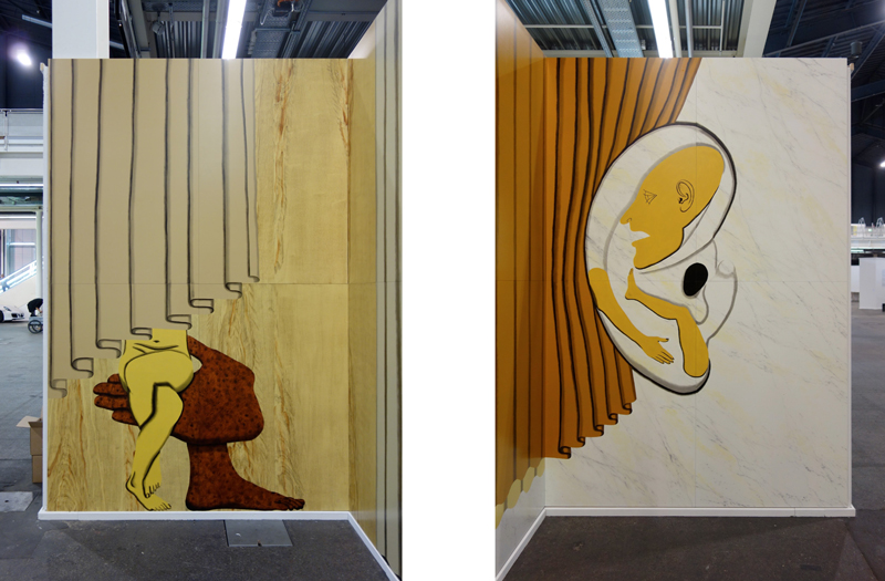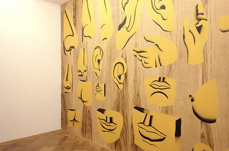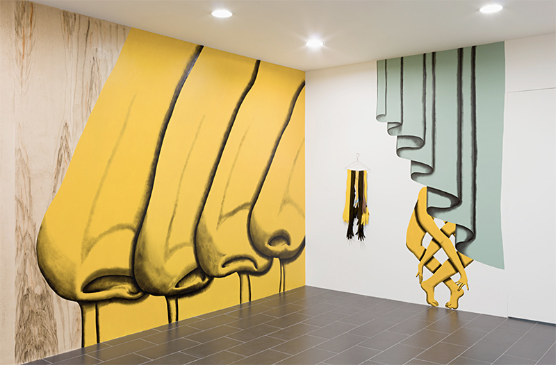 Es más evidente en el caso de la obra Charlotte Herzig’s Bathroom, una intervención en un baño con sus narices voladoras, toallas, caras grotescas y engaños visuales antropomórficos. Este trabajo reúne todos sus recursos estéticos y yo creo que es un trabajo mas clave de lo que parece en su trayectoria.
