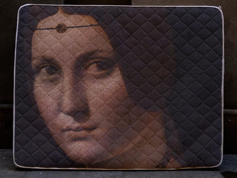 Las fotos de colchones son de la serie “Colchonismo Ilustrado”. Y narran la historia de personas desesperadas que buscan refugio temporal en colchones usados, testigos silenciosos de historias abandonadas. Promesas de un posible hogar, que ahora exhiben manchas de olvido y desencanto, fusionadas con telas de obras que Asensio encuentra en sus visitas a diferentes museos.