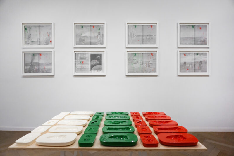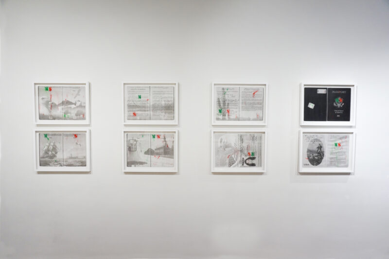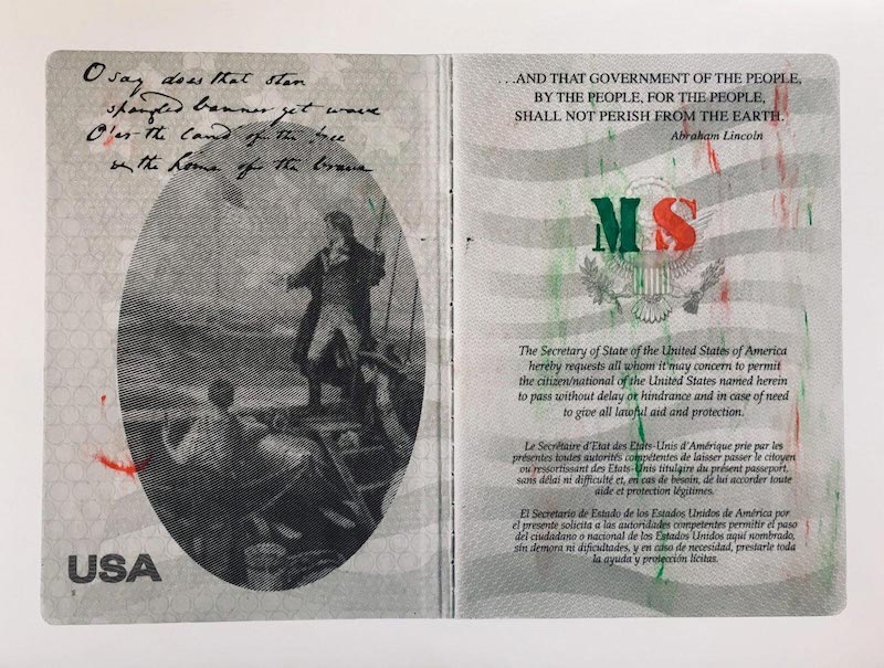 Se trata del pasaporte americano de la artista, recibido en 2017, después de 22 años viviendo en Brooklyn y Manhattan. El pasaporte de EE.UU. es una nueva identidad (burocrática) que se añade a la italiana, a la vivencia de una Roma, donde el aire de Trípoli impregnaba aún la casa familiar. En las impresiones de esas páginas, la artista estampa sus iniciales MS, en mayúsculas y en verde y rojo.