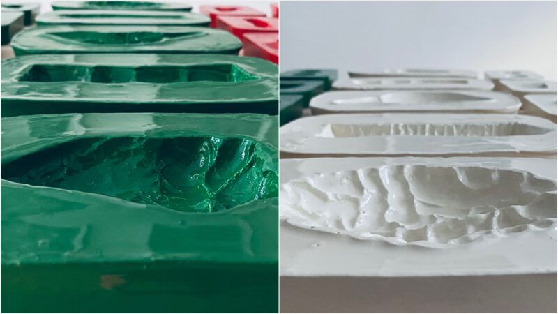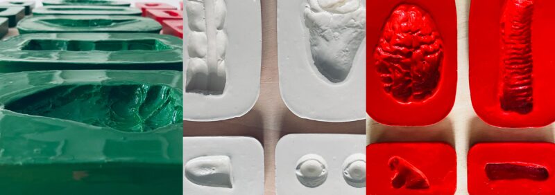El doble conjunto de esculturas, en total 30 piezas, realizadas en 2018 en yeso y cubiertas con esmalte. La primera serie, Órganos son cinco piezas que representan la huella de cinco órganos del cuerpo humano: el cerebro, la tráquea, el hígado, un tracto del intestino y el corazón.