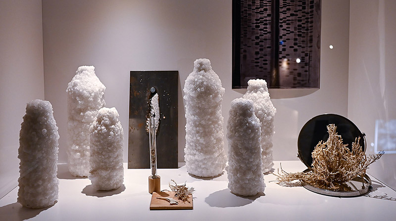 Utilizando agua salada, el material emblemático de Bondi, la artista cristaliza una serie de estanques con monedas de cobre, flores y conchas sumergidas, de cuyas silenciosas mutaciones salinas es testigo la frondosa vegetación circundante. Sin embargo, este crujiente silencio resulta engañoso ya que entre los objetos están teniendo lugar una serie de interacciones materiales que no por ser imperceptibles a simple vista resultan menos intensas. Estas relaciones invisibles, y al mismo tiempo transformadoras, entre los seres humanos, los componentes químicos y las plantas son claves en la obra de Bondi.