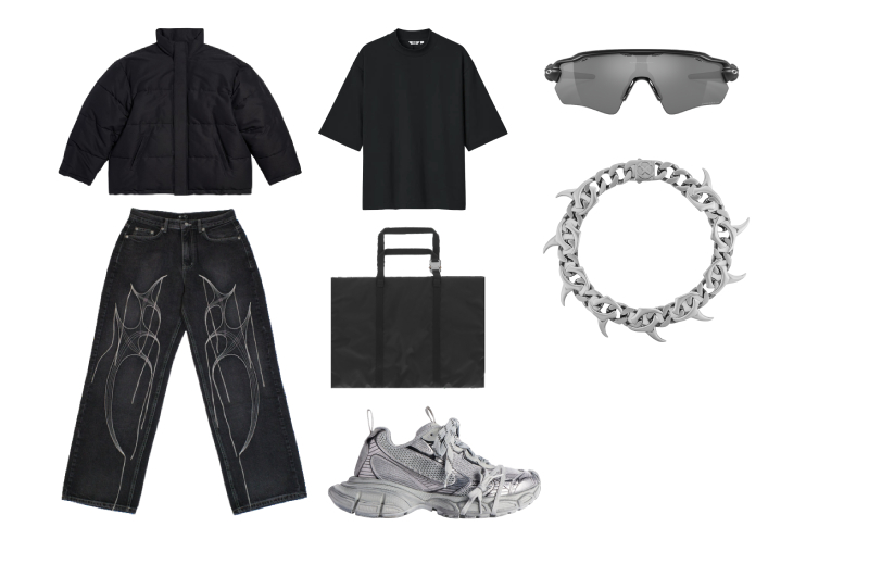 Para completar el look, lo mejor es apostar por zapatillas de estilo runner dosmileras y más aún si son exageradamente grandes, como las 3XL de Balenciaga también. Pero no os preocupéis, también hay opciones más accesibles. Como accesorios para un look como este podemos apostar por un tote-bag de nylon negro como este de 1017 Alyx 9SM, unas gafas de sol deportivas como estas de Oakley y una cadena de estética Y2K oscura (esta es de Vitaly).