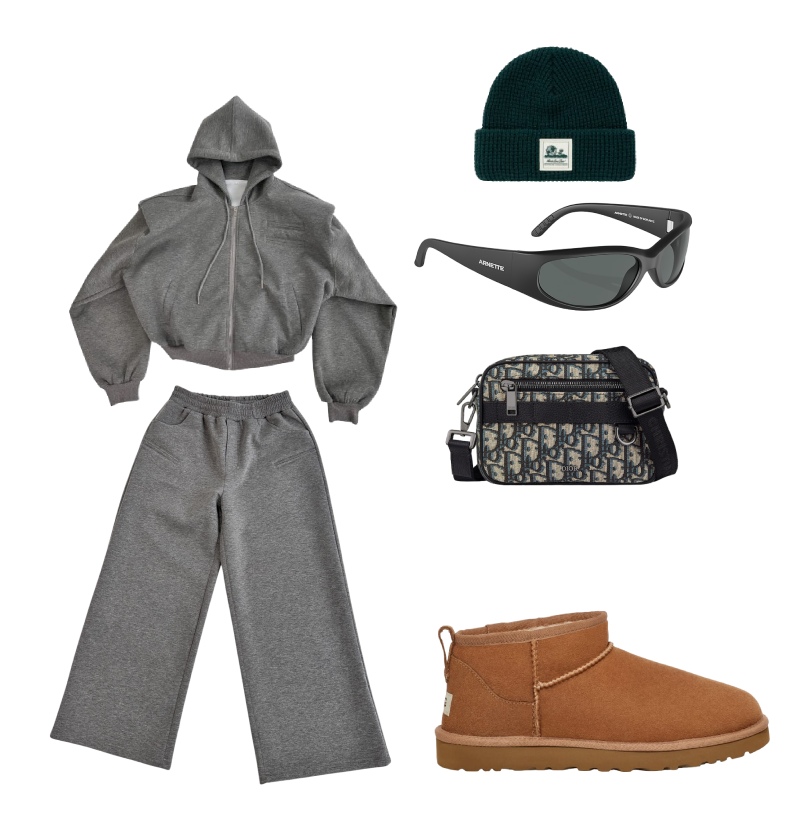 Chándal de Beaumont, Gorro de Aimé Leon Dore, Bolso de Dior, Gafas de Arnette y botas de UGG.