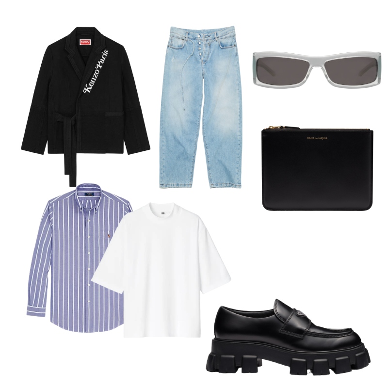 Americana de Kenzo, Camisa de Polo, Camiseta de Uniqlo, Vaqueros de Acne Studios, Gafas de Gucci, Bolso de CDG Wallet, Mocasines de Prada.