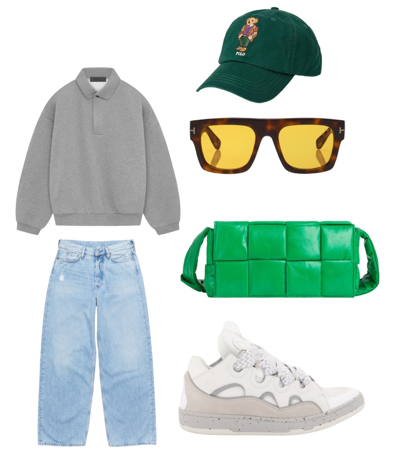 De base podemos usar cualquier camiseta y de pantalones, unos vaqueros de corte baggy con algún que otro detalle de desgaste, como estos de Acne Studios. Al ser un look de fin de semana tan minimalista, tenemos que jugar mucho con los accesorios. Para ello, fichamos una gorra verde de Polo con el icónico Polo Bear, para acentuar ese aire preppy urbano. Unas gafas de sol clásicas también serán una opción infalible, pero tienen que tener la montura en acabado de carey. Para acentuar un poco con un toque de color, nuestro bolso puede ser de un statement color, como el verde Bottega. Y para cerrar todo con un estilo skater elevado, unas zapatillas inspiradas en las siluetas skater de finales de los 90 (estas son de Lanvin).