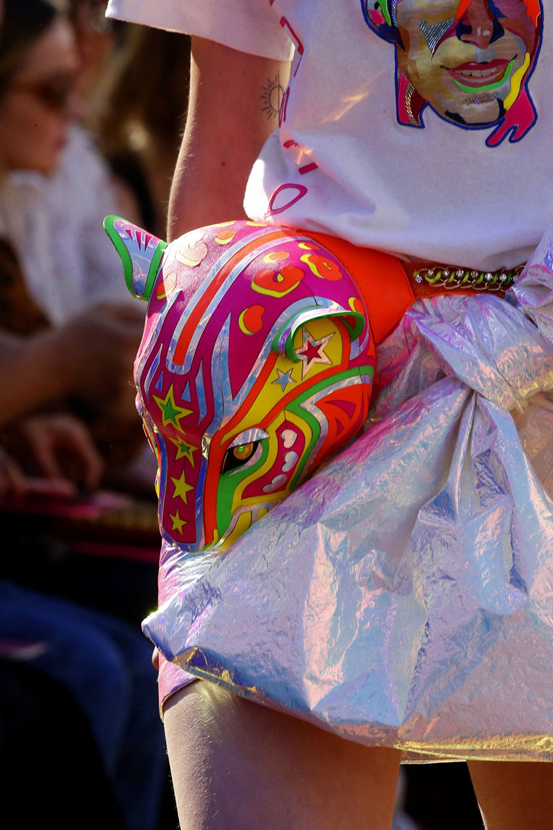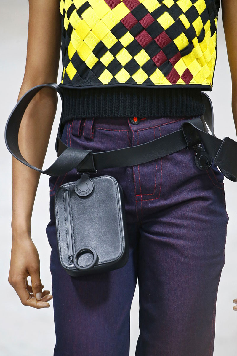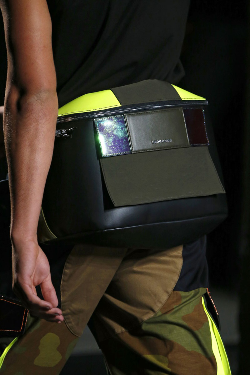 Formas exageradas en las propuestas de casas como Dsquared2 que llaman la atención y pretenden dar un twist colocando las riñoneras como si fueran para sentarte en una bicicleta de competición.