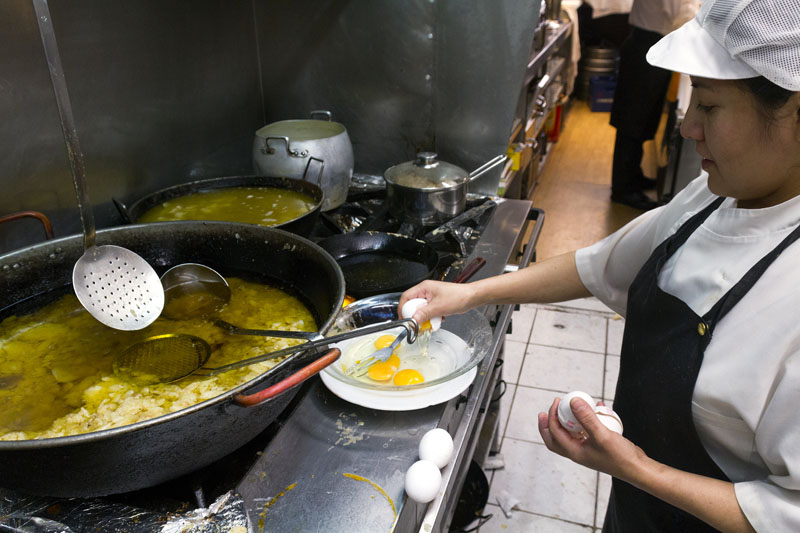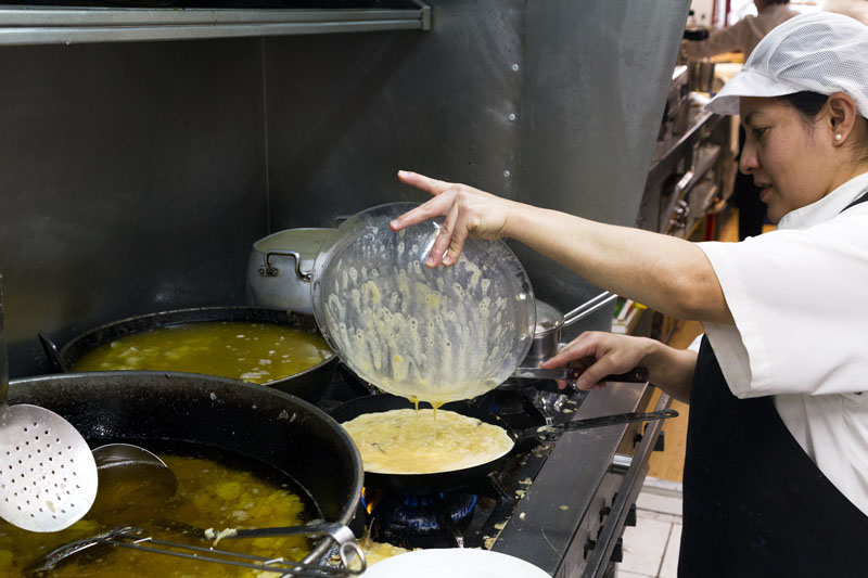 Las tres imágenes de arriba: Proceso de como hacer la tortilla de patatas en el restaurante Sylkar. Foto: Miguel Á. Palomo