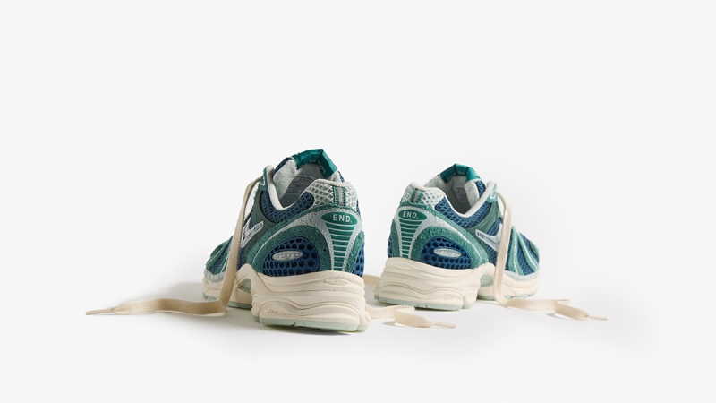 Y como era de esperarse, las ProGrid Triumph 4 de Saucony X END. reposan sobre una suela deportiva. El lower de la silueta se presenta en goma EVA blanca envejecida y se acentúa con detalles muy sutiles de verde aguamarina y gis pálido, siguiendo el look principal.