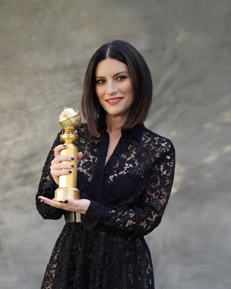 La cantante Laura Pausini con el Globo de Oro en el año 2021 por su canción “Io Sì”, tema de la película italiana “La vida por delante”
